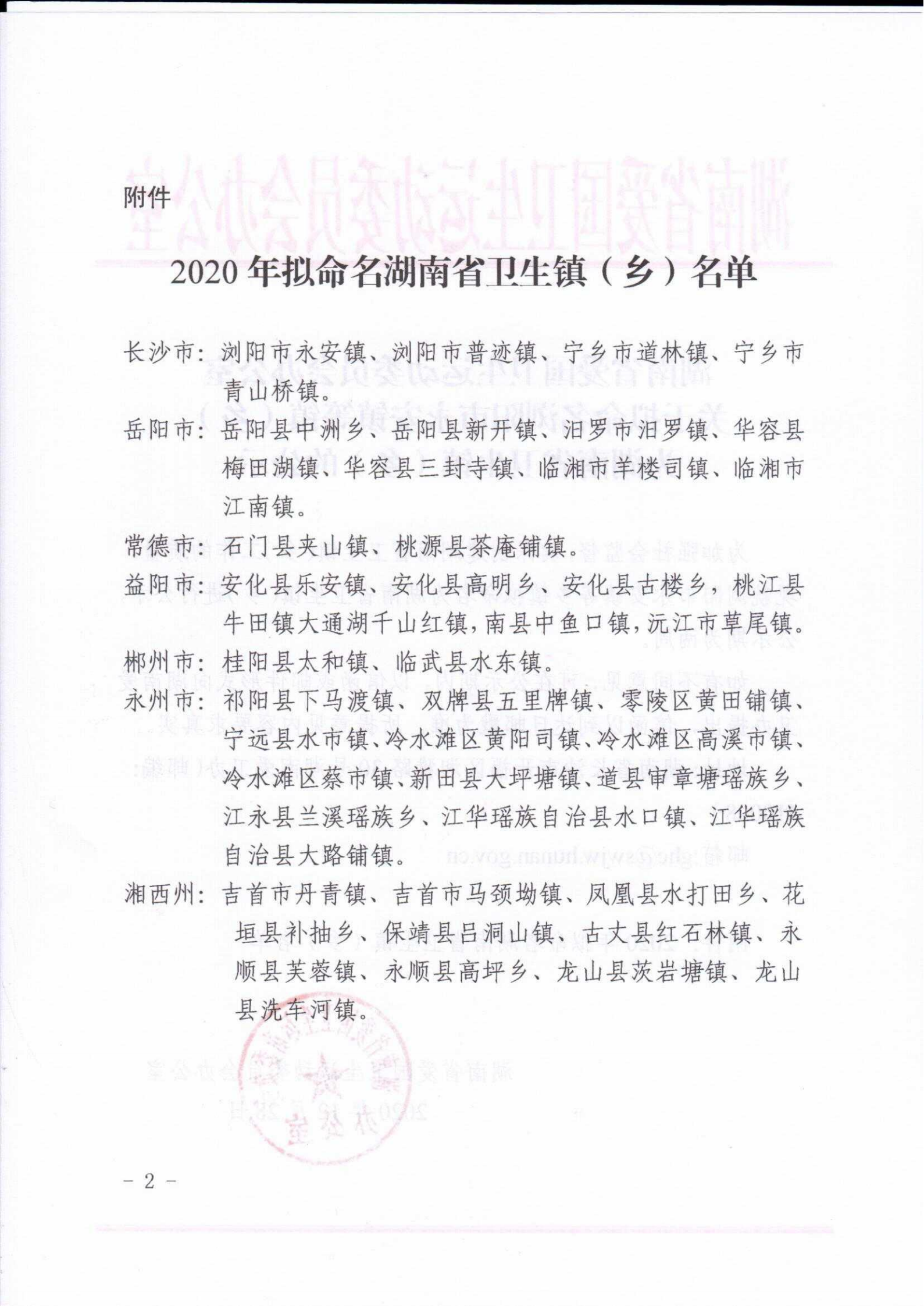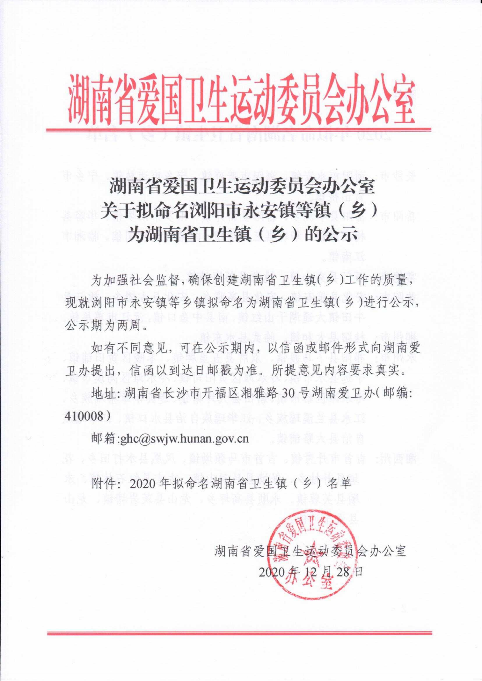 湖南省爱国卫生运动委员会办公室关于拟命名浏阳市永安镇等镇(乡)为湖南省卫生镇(乡)的公示