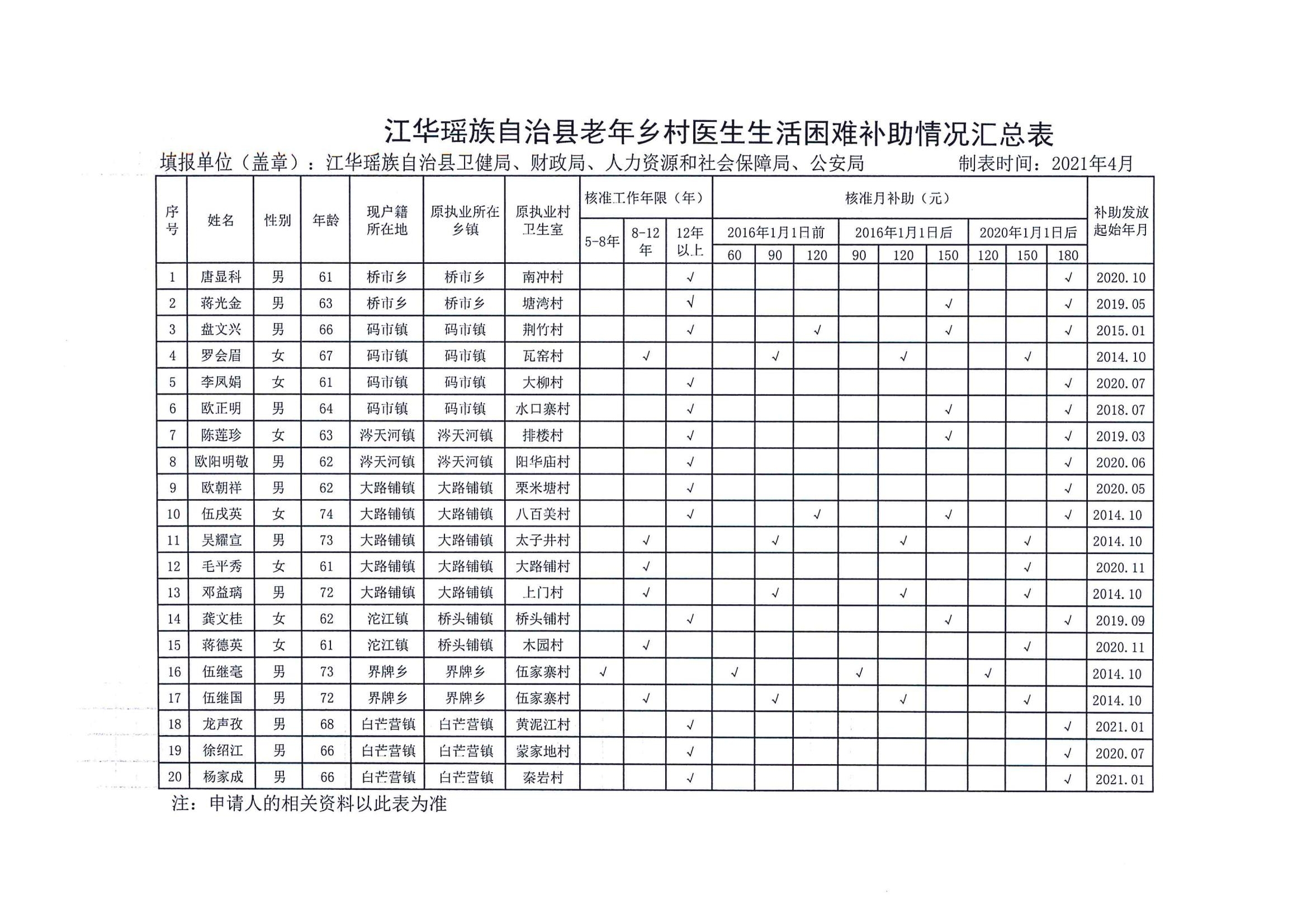 江华瑶族自治县老年乡村医生生活困难补助情况公示