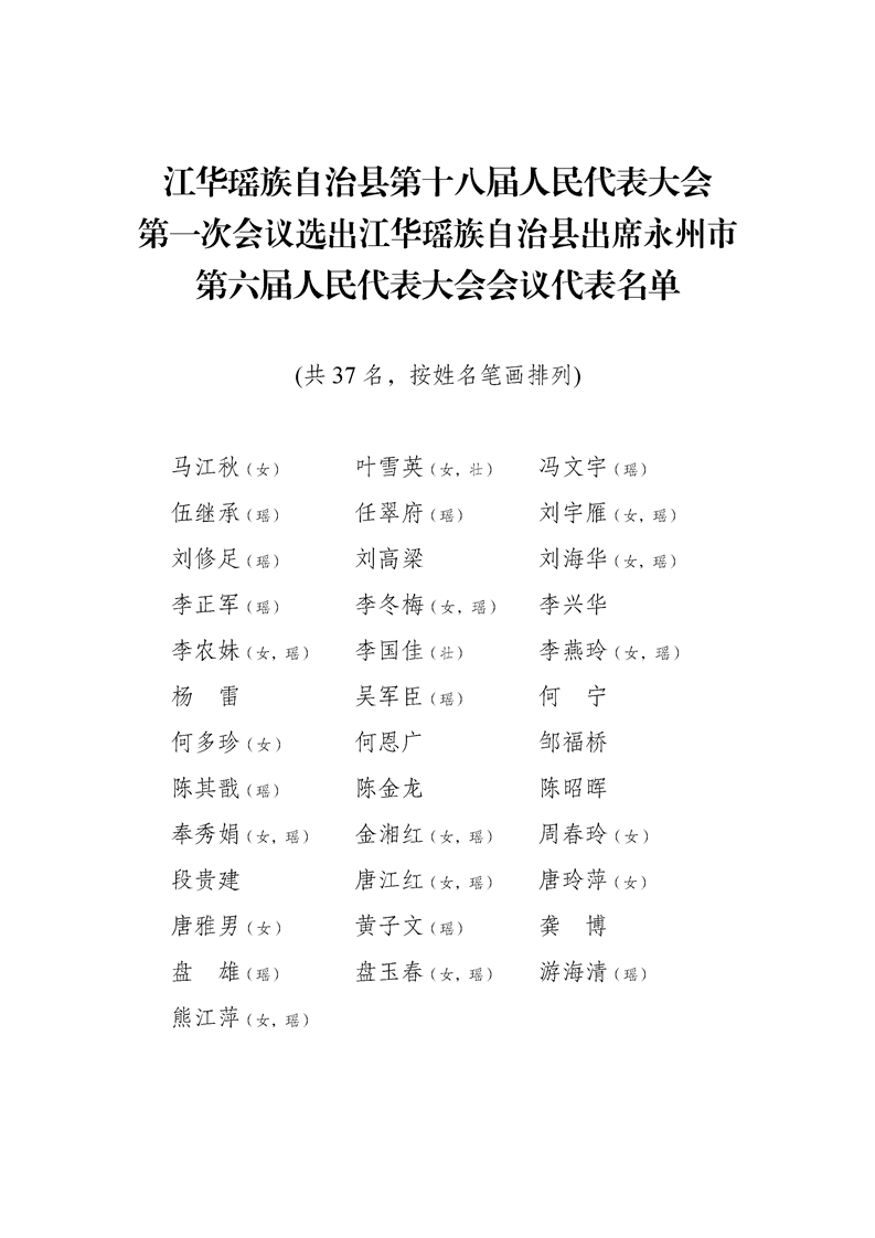 江华瑶族自治县第十八届人民代表大会第一次会议选出江华瑶族自治县出席永州市第六届人民代表大会会议代表名单