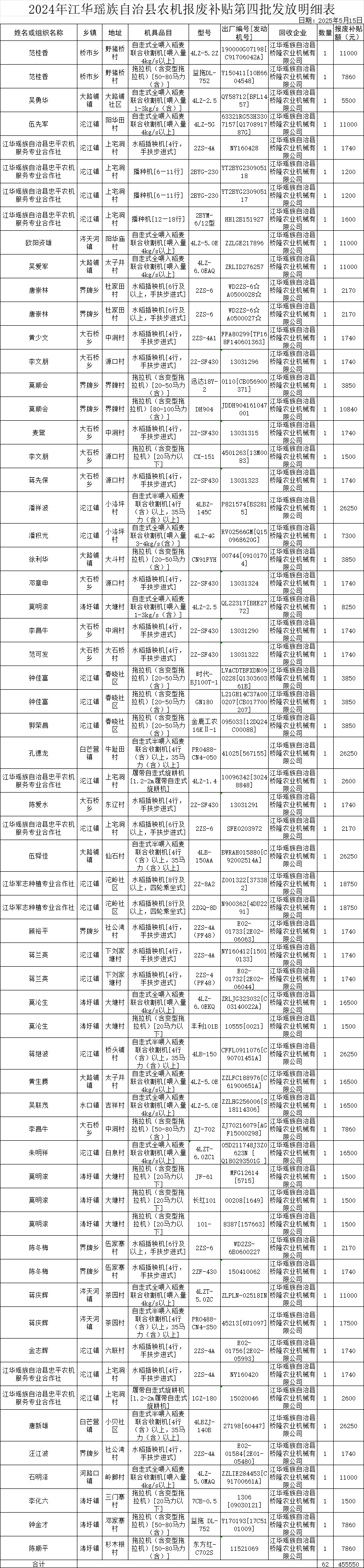 2024年江华瑶族自治县农机报废补贴第四批发放明细表