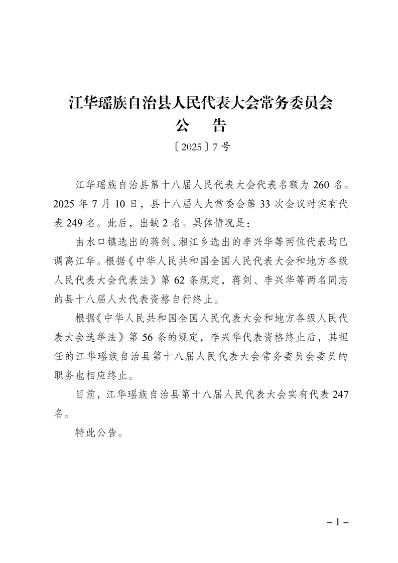 江华瑶族自治县人民代表大会常务委员会 公 告〔2025〕7号
