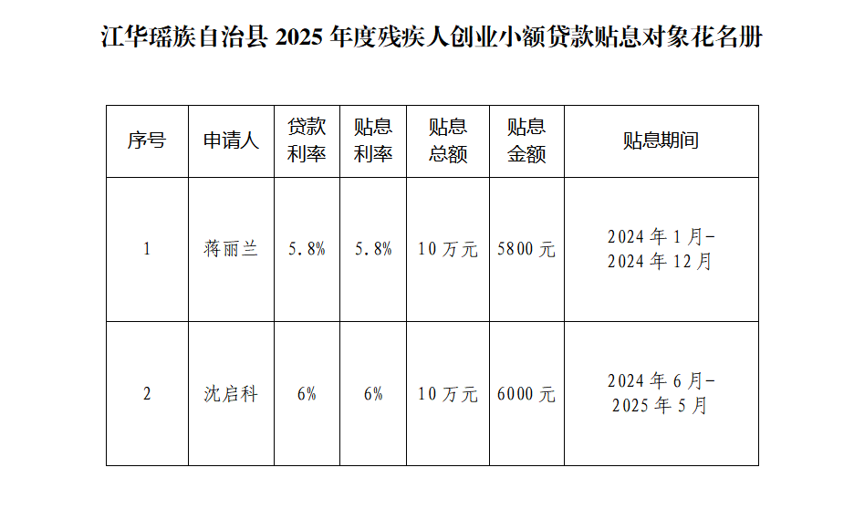 根据湖南省残疾人联合会《湖南省残疾人创业小额贷款贴息项目方案》(湘残联字[2015]48号)文件要求,经过个人申报、县残联审核、县财政局核实等程序,现对江华瑶族自治县2025年度残疾人创业小额贷款贴息对象予以公示,