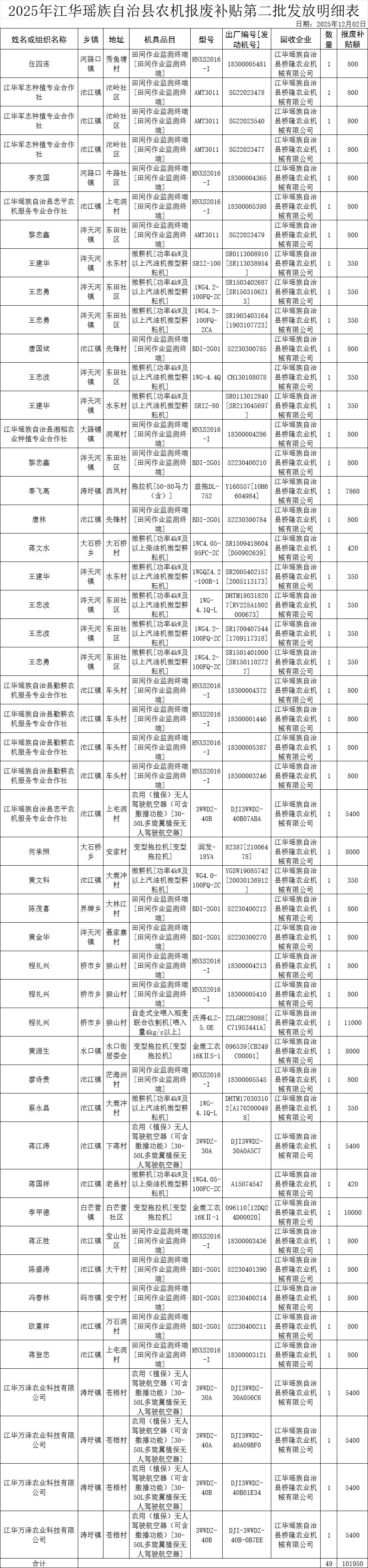 2025年江华瑶族自治县农机报废补贴第二批发放明细表