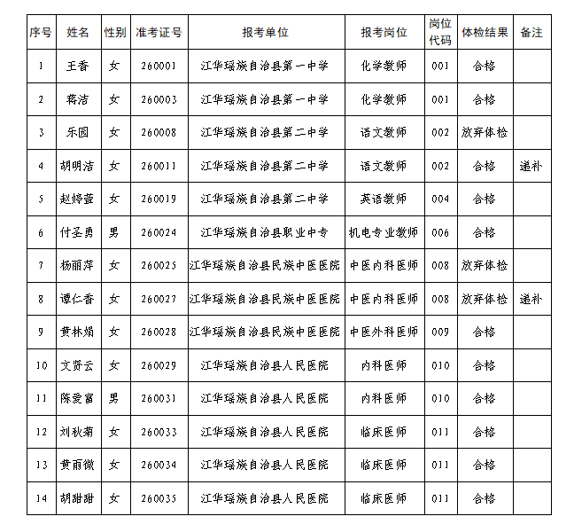 江华瑶族自治县2026年引进急需紧缺专业人才体检结果公示
