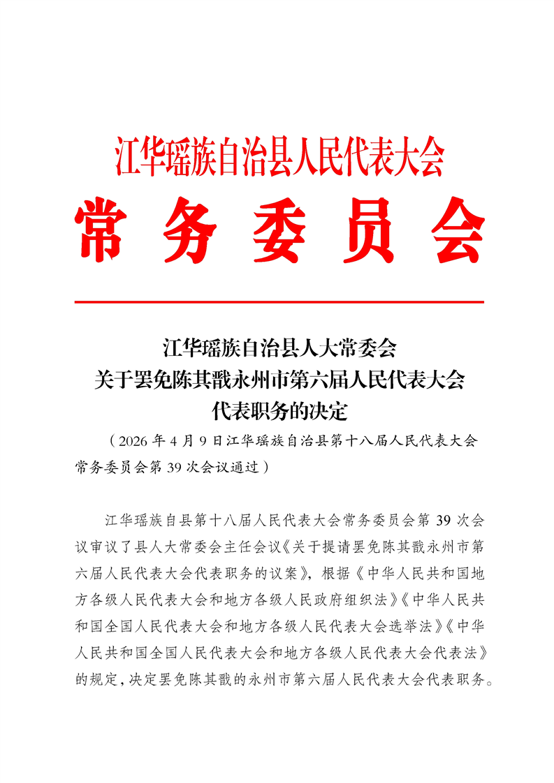 江华瑶族自治县人大常委会关于罢免陈其戬永州市第六届人民代表大会代表职务的决定