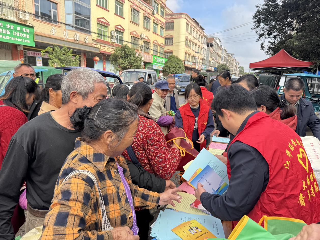 活动现场,工作人员设立咨询台、悬挂横幅、摆放精美礼品,热火朝天的工作氛围、丰富多样的法治宣传资料很快吸引了过往群众前来咨询了解。结合村民生活实际,聚焦山林水事土地纠纷、婚恋家庭纠纷、劳动纠纷、民间借贷等问题,志愿者向过往赶集的群众发放山林土地权属纠纷、防性侵、扫黄打非、禁毒、反电诈、扫黑除恶、反邪教主题宣传单页,以案释法,向群众介绍与生活息息相关的法律常识,引导大家在遇到矛盾时“找法、用法、靠法”。