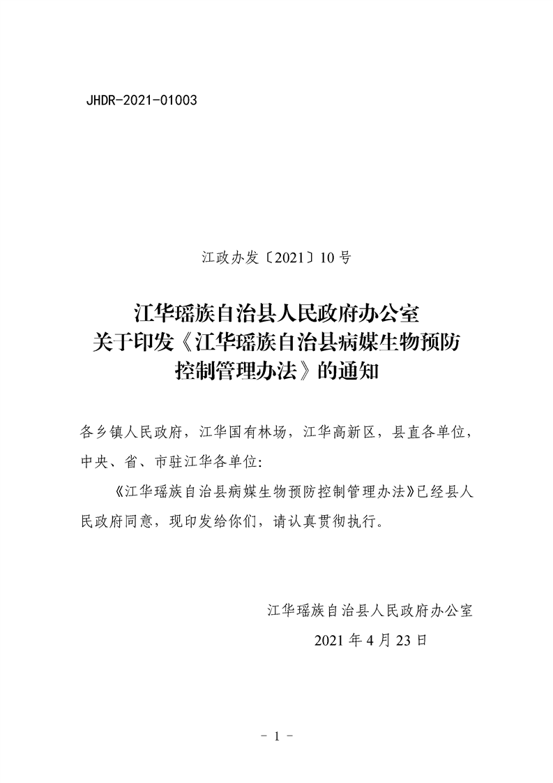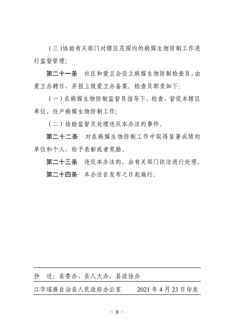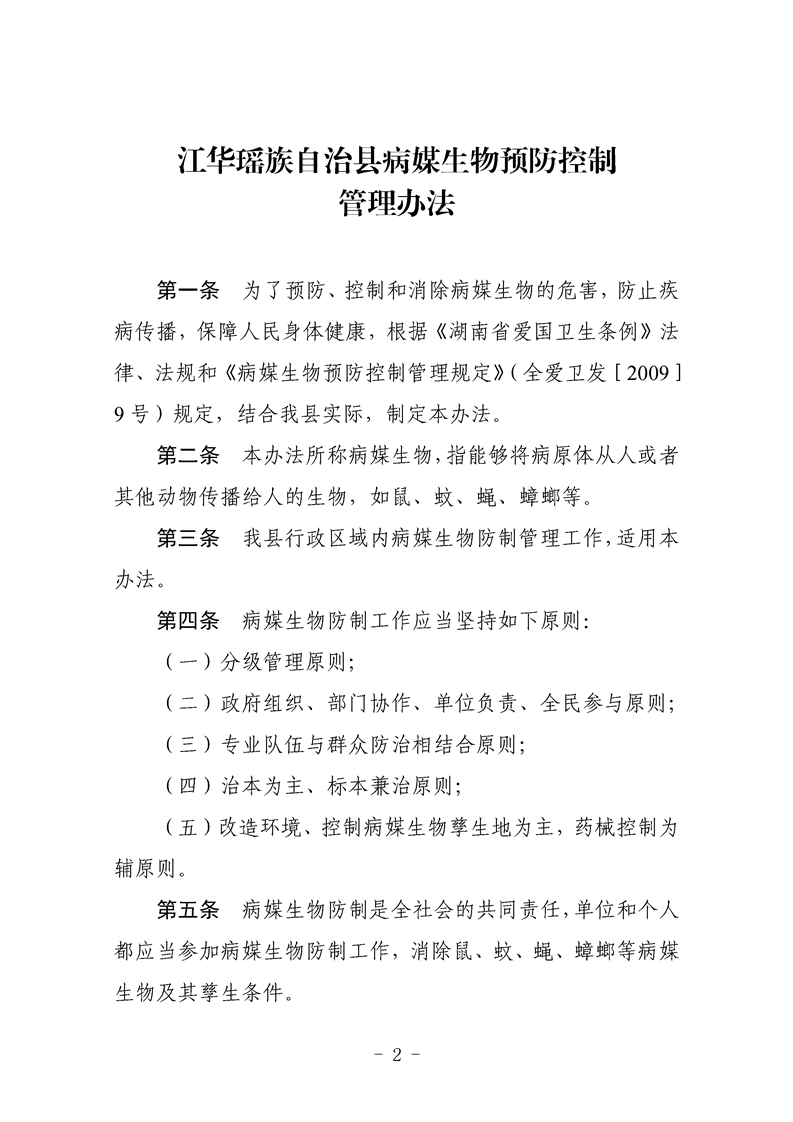 江华瑶族自治县人民政府办公室关于印发《江华瑶族自治县病媒生物预防控制管理办法》的通知
