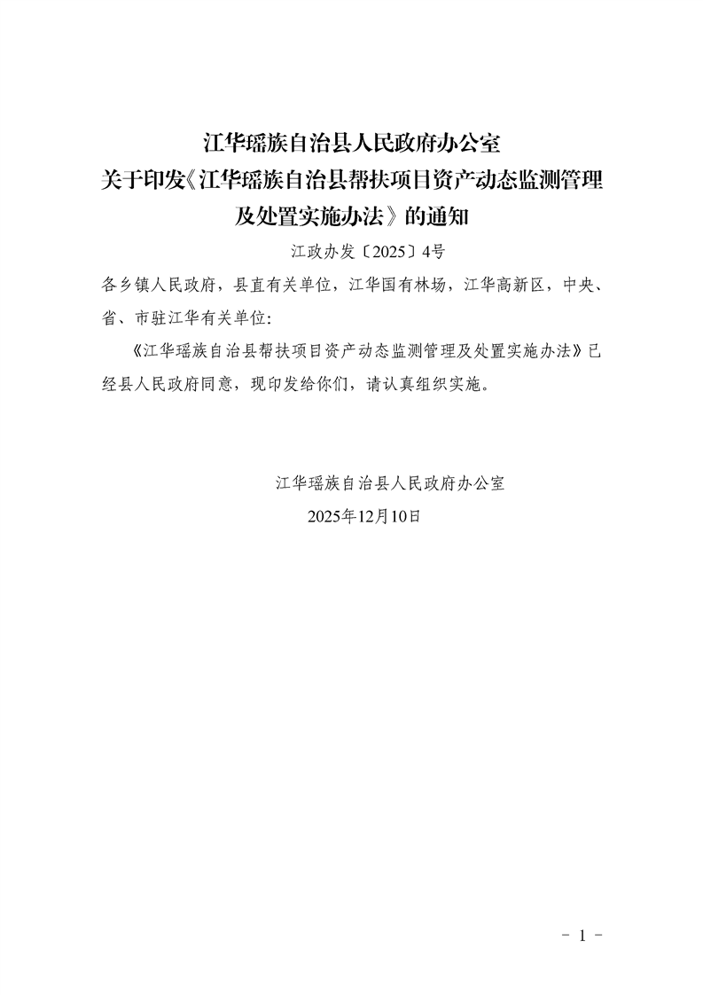 江华瑶族自治县人民政府办公室关于印发《江华瑶族自治县帮扶项目资产动态监测管理及处置实施办法》的通知