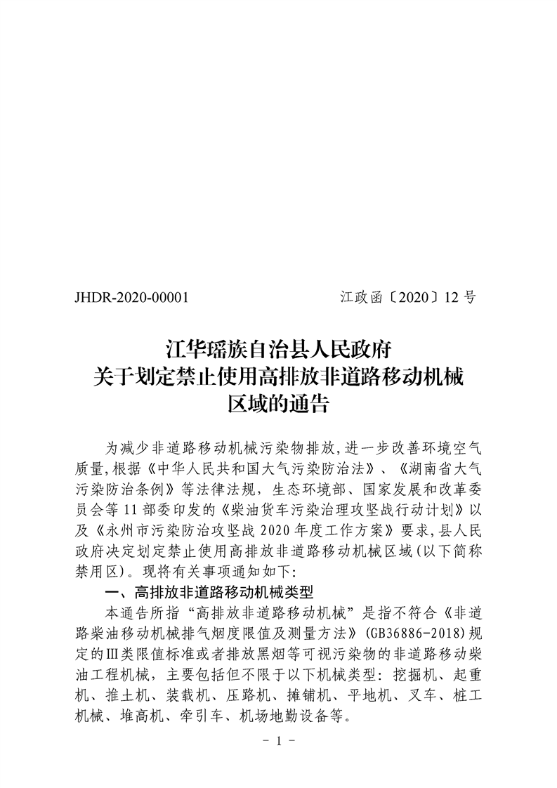 江华瑶族自治县人民政府关于划定禁止使用高排放非道路移动机械区域的通告