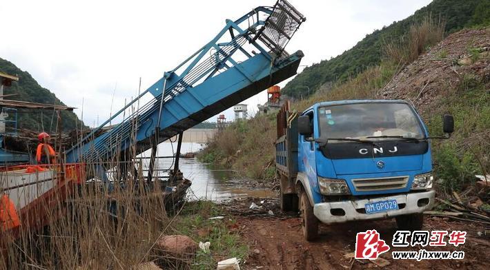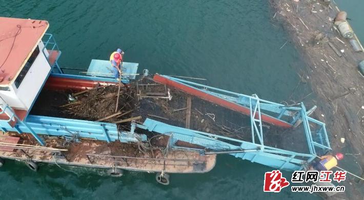 在涔天河库区务江大桥至大坝段,因雨水冲洗,大量的植被、树干沉积在河面上,拥堵在码头的船只附近,给船只出航造成了困难。负责清理的湖南源源生态保洁项目部分派自动化打捞和人工打捞两组同步清理浪渣。在打捞现场,浪渣清理员把库面体积大、长度超标的树干等浪渣人工打捞上船,然后由专业自动化打捞船快速打捞体积小浪渣,既保障了安全,也提高了效率。