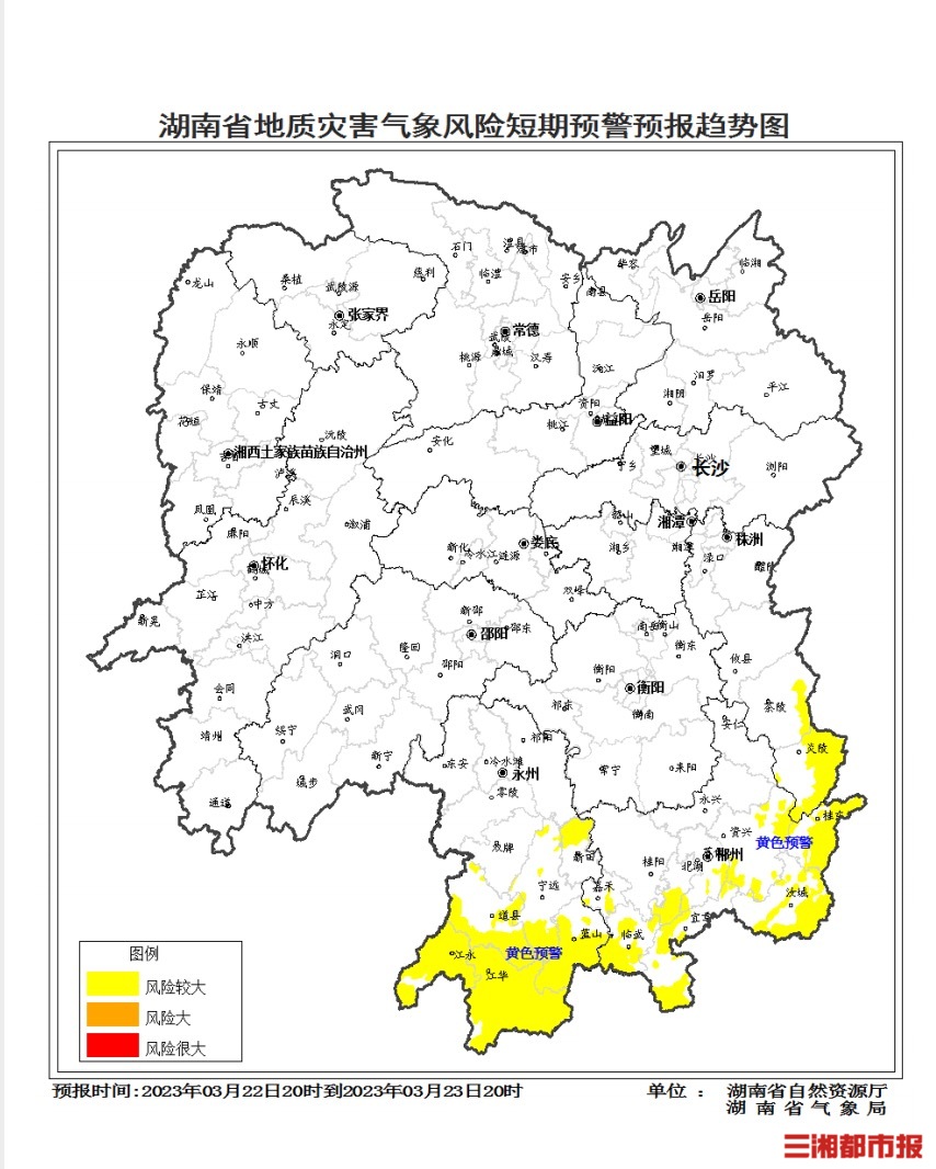 根据地质灾害成灾规律和孕灾条件,结合2023年3月22日短期气象预报情况,省自然资源厅与省气象局联合会商得出如下结 论:自3月22日20:00至23日20:00,受降雨影响,湘南部分区域发生突发性地质灾害风险较大(黄色预警)。