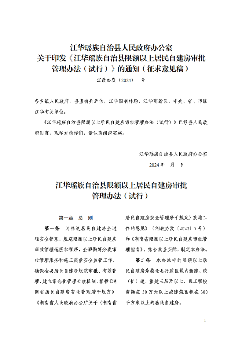 《江华瑶族自治县限额以上居民自建房审批管理办法(试行)》(征求意见稿)