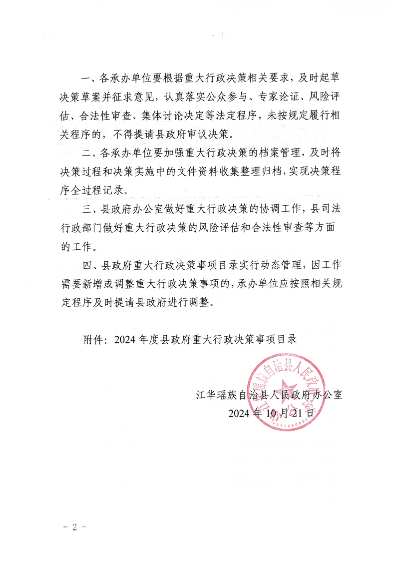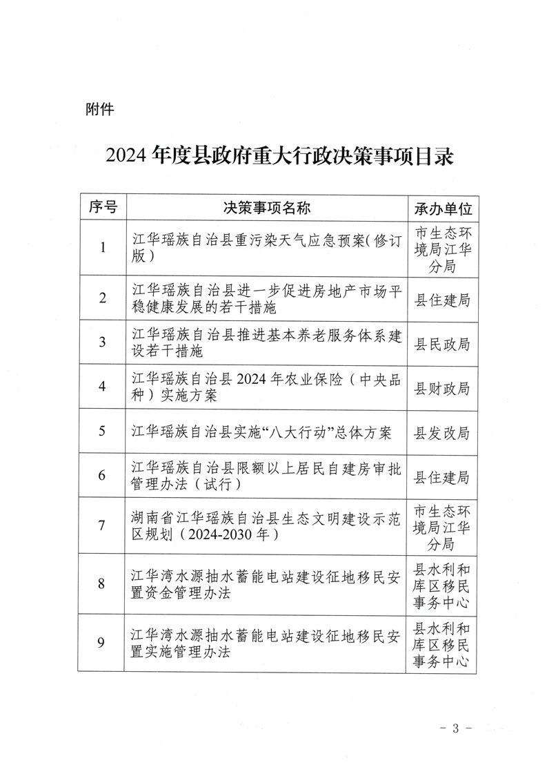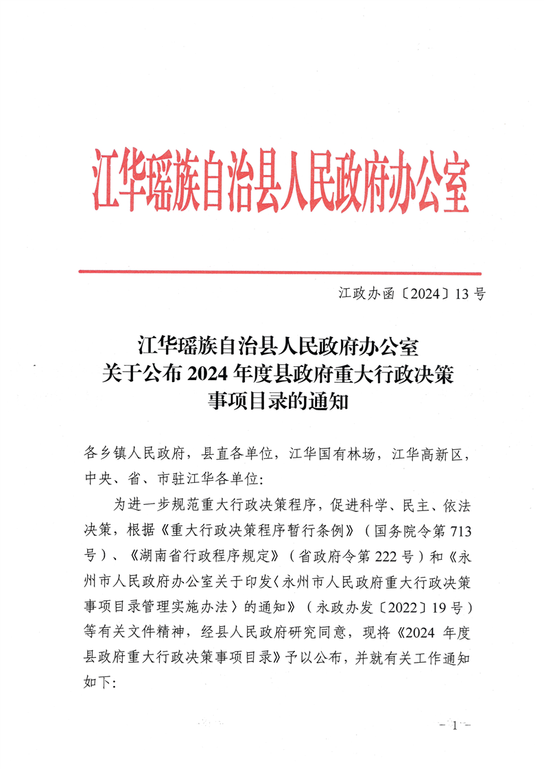 江华瑶族自治县人民政府办公室关于公布2024年度县政府重大行政决策事项目录的通知