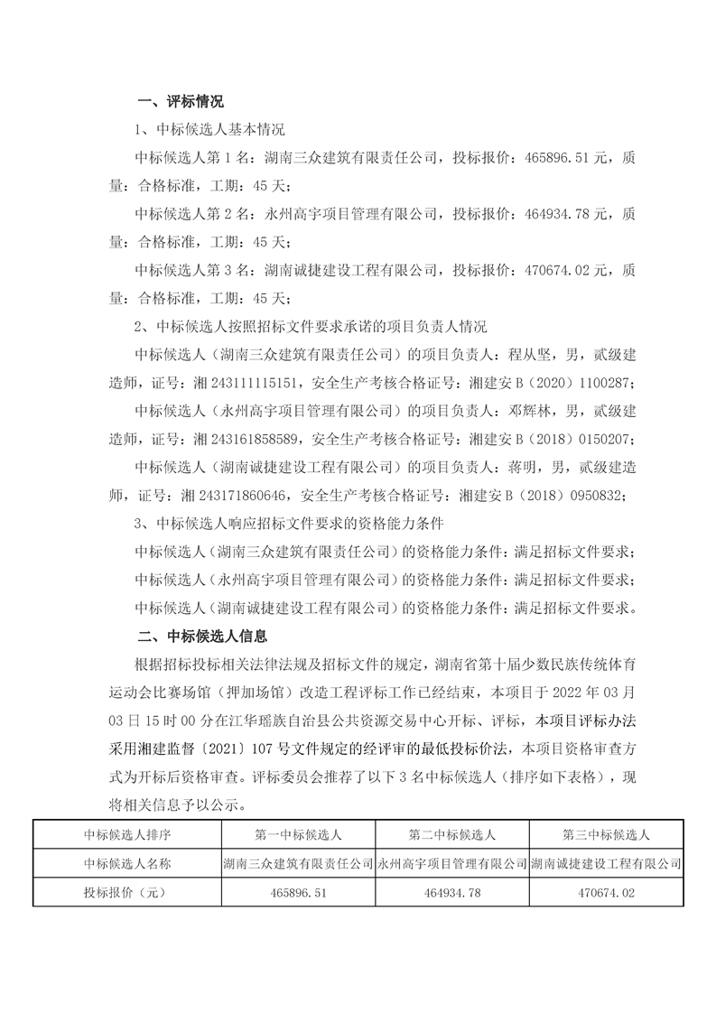湖南省第十届少数民族传统体育运动会比赛场馆(押加场馆)改造工程中标候选人公示