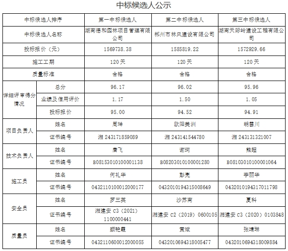 中标候选人第2名:郴州市林风建设有限公司,投标报价:1585819.22元,质量:合格标准,工期:120天;