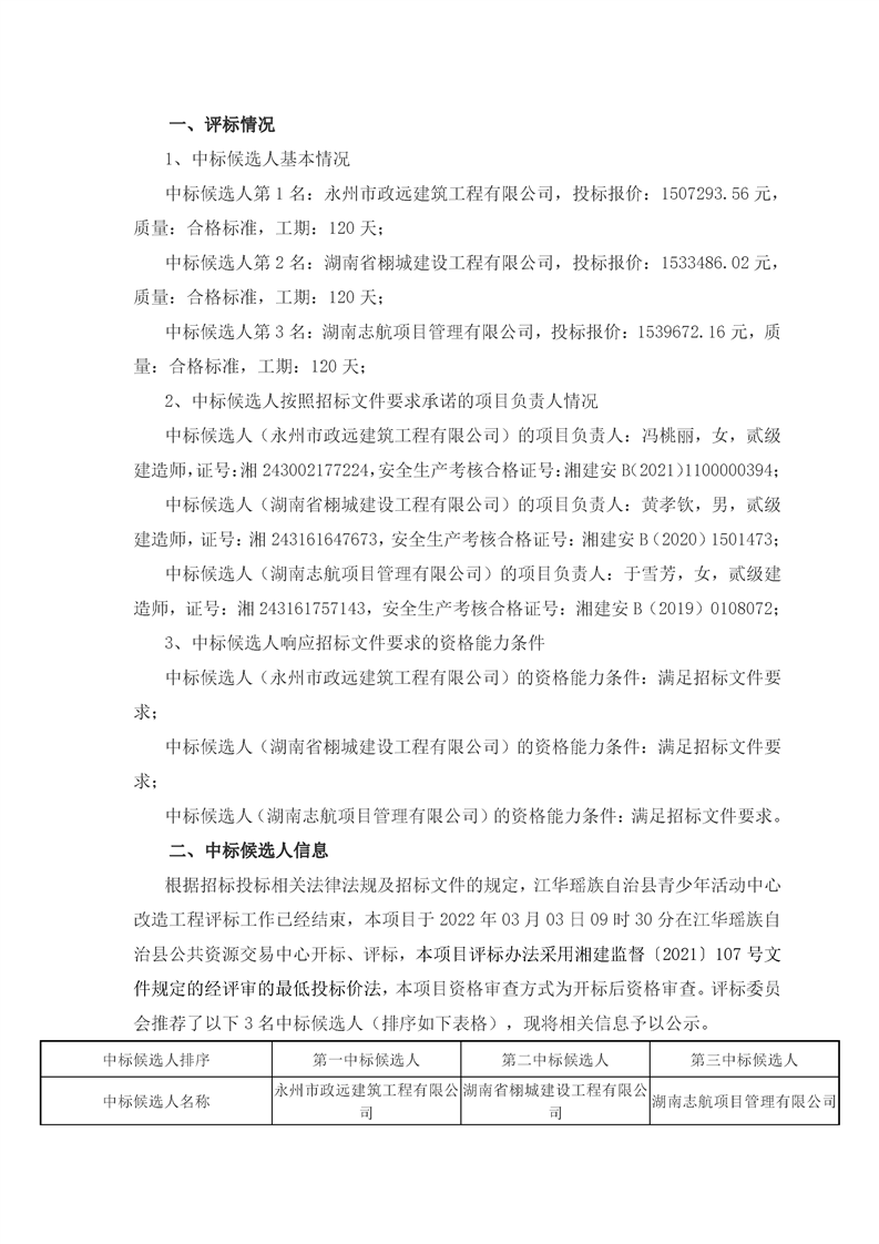 江华瑶族自治县青少年活动中心改造工程中标候选人公示