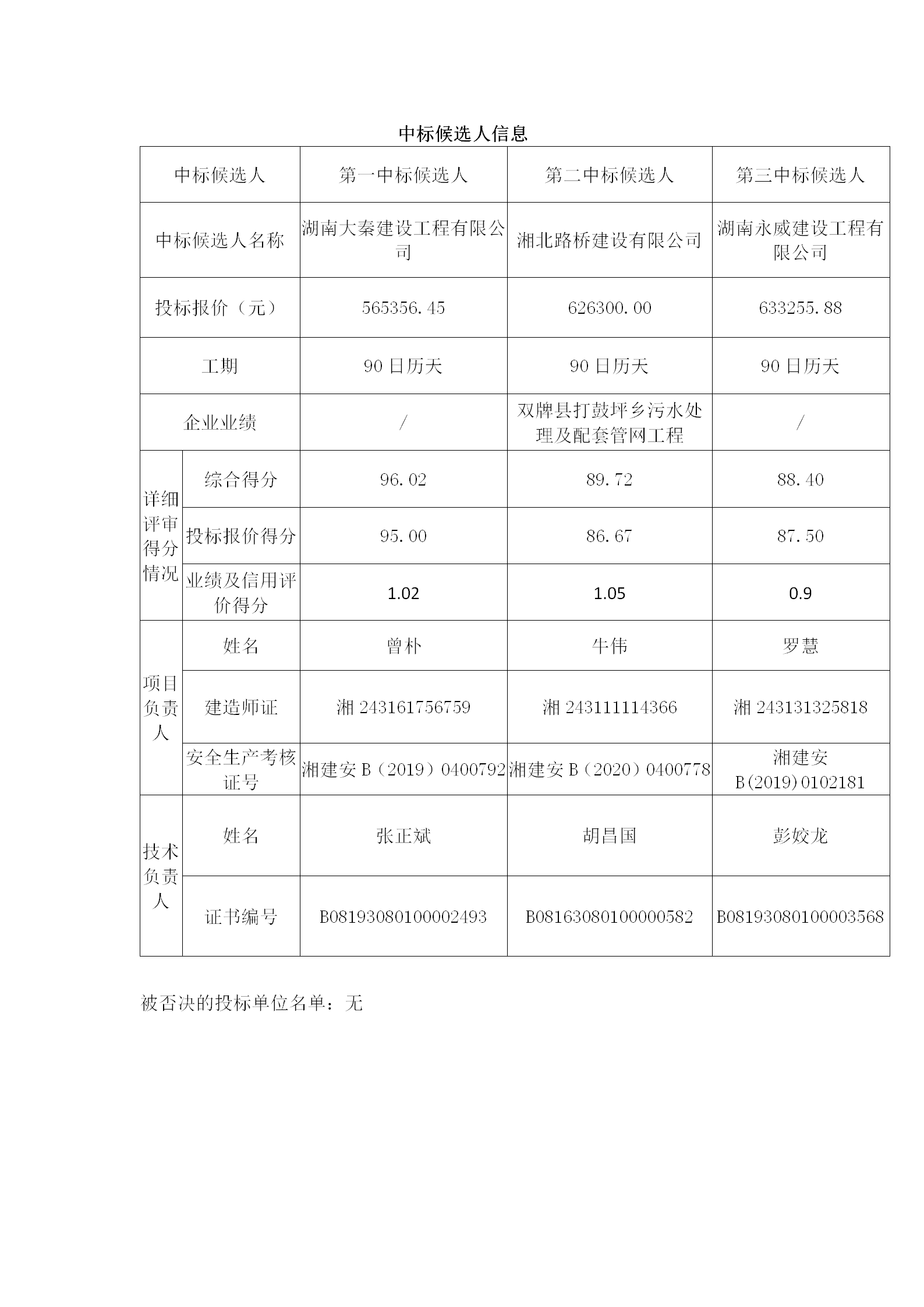 根据招标投标相关法律法规及招标文件的规定,沱江镇双顾村城乡供水一体化项目评标工作已经结束。本项目资格审查采用开标后资格审查方式,评标办法采用湘建监督[2021]107号文件规定的“经评审的最低投标价法”。评标委员会推荐了以下3名中标候选人(排序),现将相关信息予以公示。公示期:公示期为3个工作日,公示期内如对中标候选人无异议,公示期满后,招标人将确定第一中标候选人为中标人。