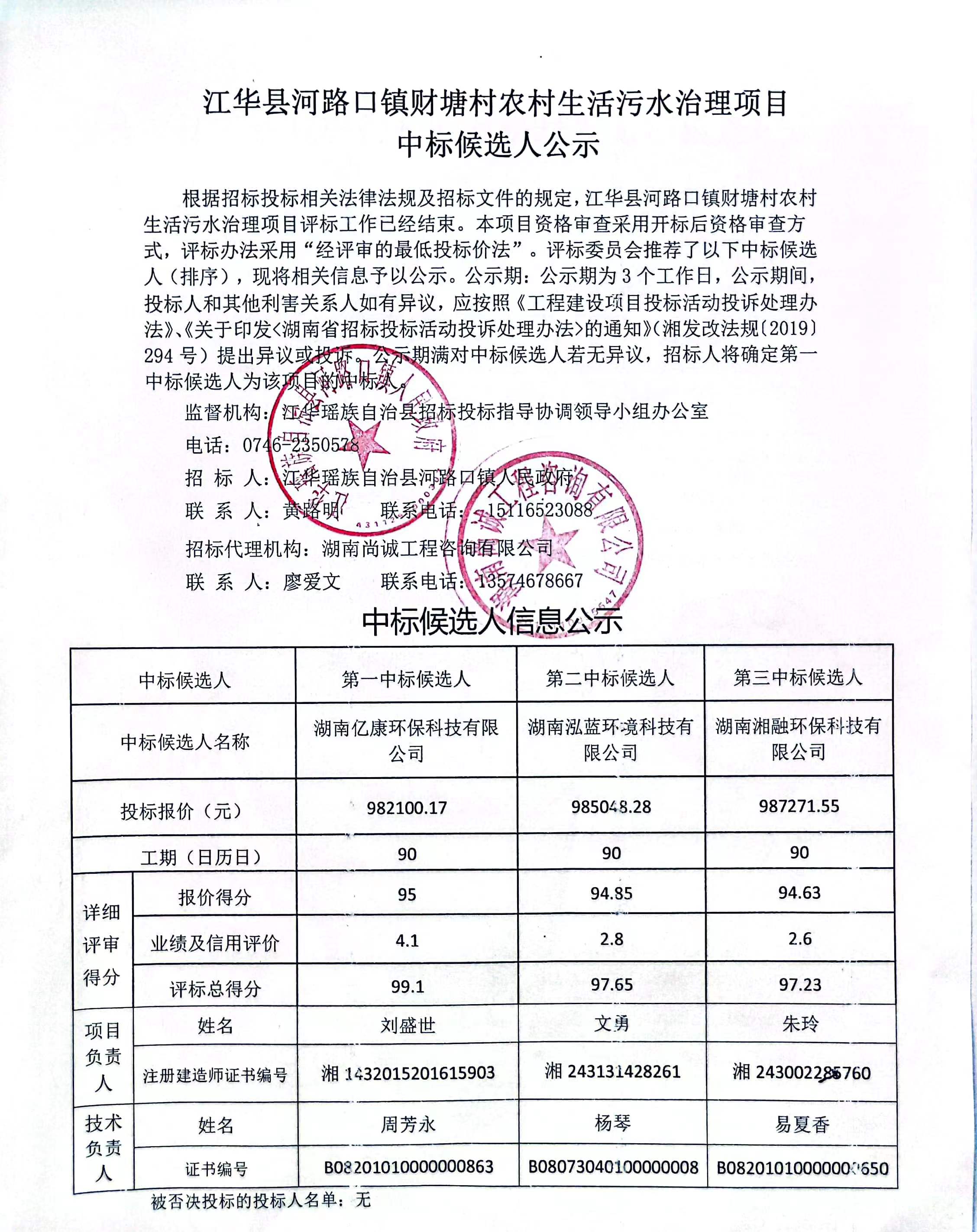 江华县河路口镇财塘村农村生活污水治理项目中标候选人公示