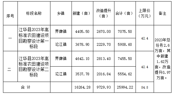 2.2 建设规模:江华县2023年高标准农田建设项目勘测设计计划建设高标准农田约2.65万亩,2023年总投资约为4240万元。设计内容包括土地平整、土壤改良、灌溉与排水、高效节水灌溉、田间道路、农田防护与生态环境保护、农田输配电、科技推广措施等。