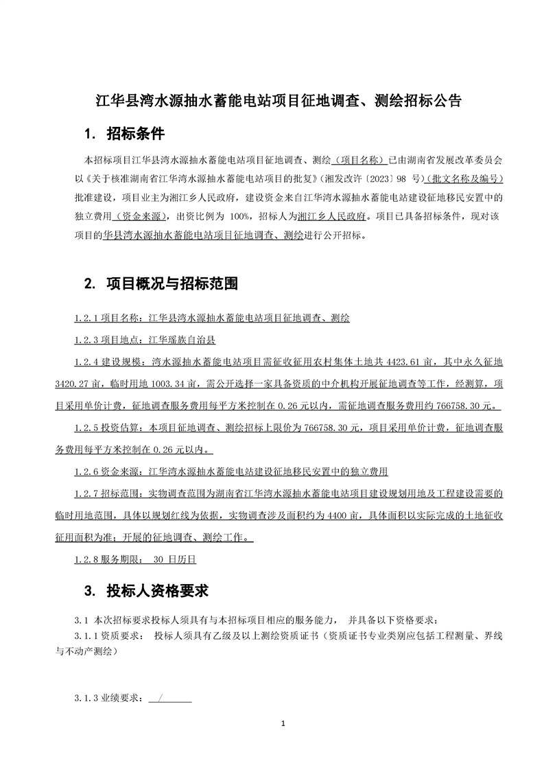 江华县湾水源抽水蓄能电站项目征地调查、测绘招标公告