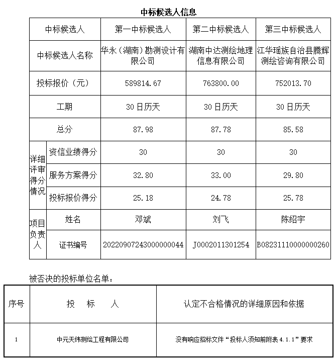 根据招标投标相关法律法规及招标文件的规定,江华县湾水源抽水蓄能电站项目征地调查、测绘评标工作已经结束。本项目评标办法采用“综合评估法”。资格审查方式为资格后审。评标委员会推荐了以下3名中标候选人(排序),现将相关信息予以公示。