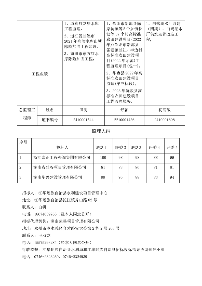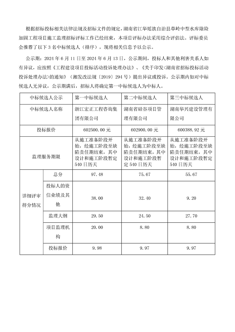 湖南省江华瑶族自治县草岭中型水库除险加固工程项目施工监理中标候选人公示