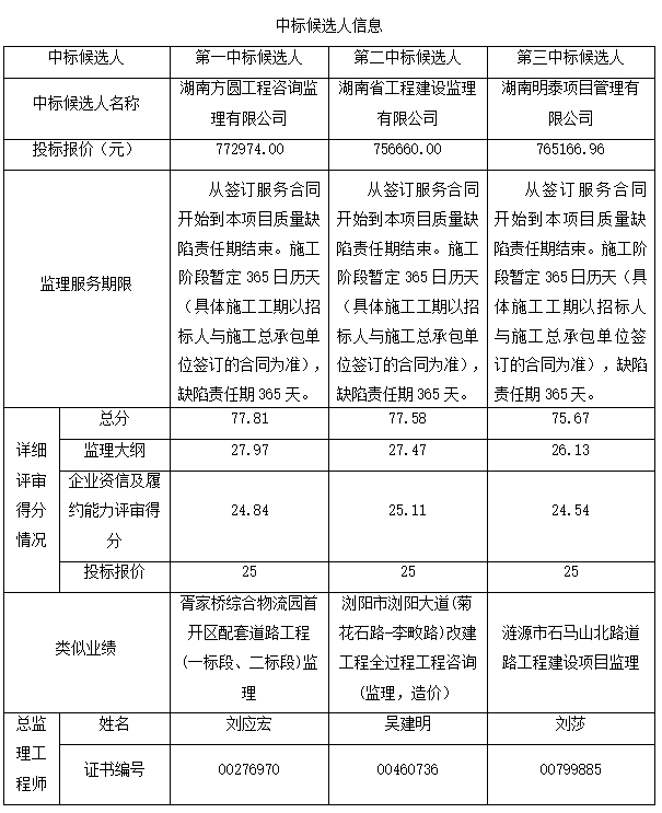 根据招标投标相关法律法规及招标文件的规定,江华县城市停车场建设项目监理评标工作已经结束,本招标项目评标办法采用湘建监督〔2021〕234 号文件规定的“综合评估法”,资格审查方式为资格后审,评标委员会推荐了以下3名中标候选人,现将相关信息予以公示。公示期2024年8月9日至2024年8月14日。