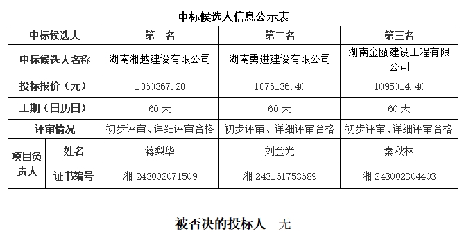 根据招标投标相关法律法规及招标文件的规定,2024年江华瑶族自治县涔天河至水口X081县道山体滑坡生态修复项目评标工作已经结束。本项目采用“经评审的最低投标价法”,评标委员会推荐了以下3名中标候选人(排序),现将相关信息予以公示。公示期:本公示发布之日起3个工作日。公示期间招标人受理投标人或者其他利害关系人有单位公章或个人署名的、对评标结果提出的异议。公示期满对中标候选人若无异议,招标人将确定第一中标候选人为该项目的最终中标人。