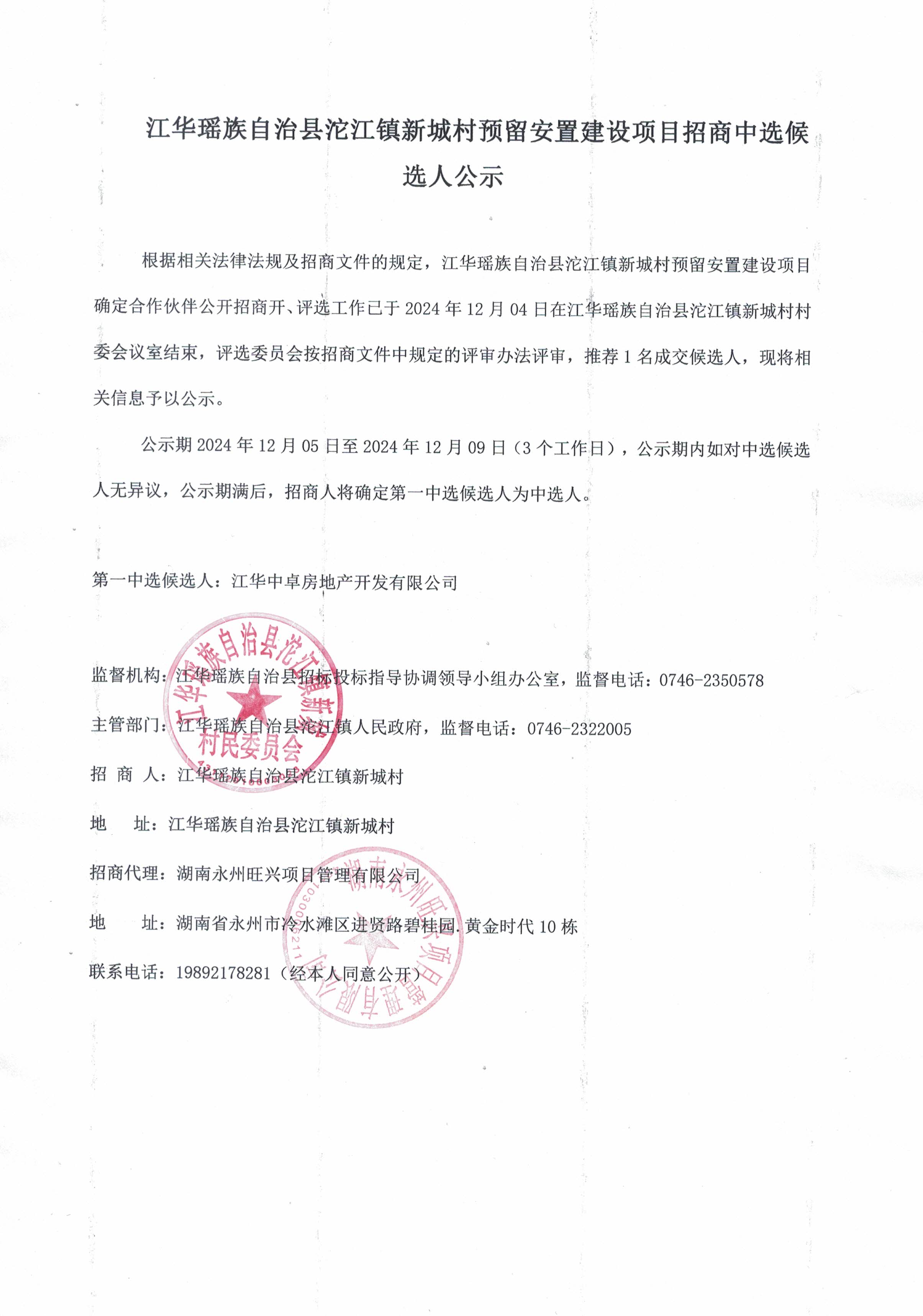 江华瑶族自治县沱江镇新城村预留安置建设项目招商中选候选人公示
