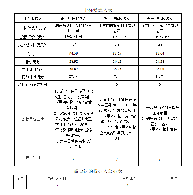 湖南紫霖项目管理有限责任公司受江华瑶族自治县自来水公司的委托,代理江华瑶族自治县城区供水设施提质改造项目主材采购招标,于2025年06月20日09时30分(北京时间)在 江华瑶族自治县自来水公司会议室(江华瑶族自治县沱江镇春晓路56号)进行了开评标,在江华瑶族自治县城市管理和综合执法局监督下,依法组建的评标委员会按照招标文件确定的评标原则和评标办法进行了细致的评审,并推荐本项目中标候选人排名如下表格: