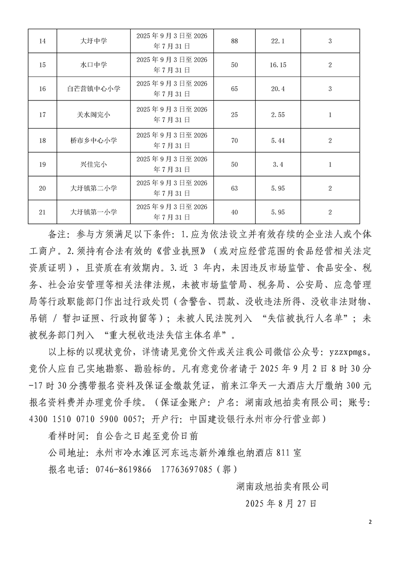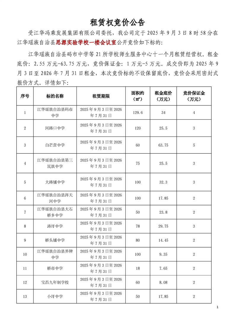 江华瑶族自治县码市中学等21所学校师生服务中心十一个月租赁经营权竞价公告