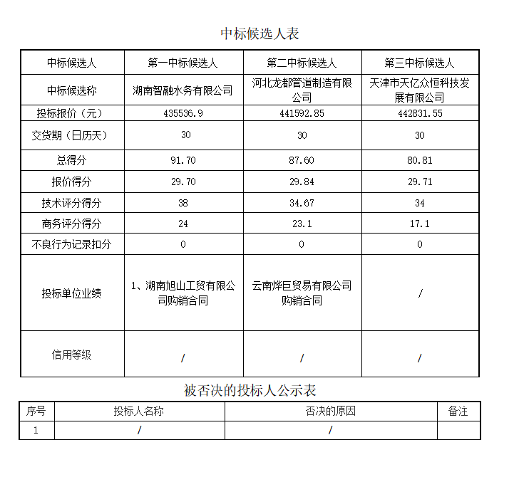 天策致远工程咨询管理有限公司受江华瑶族自治县自来水公司的委托,代理江华瑶族自治县涔天河水厂农村管网延伸项目--大路铺镇水晶深村项目主材采购招标,于2025年10月09日15时00分(北京时间)在 江华瑶族自治县自来水公司会议室(江华瑶族自治县沱江镇春晓路56号)进行了开评标,在江华瑶族自治县城市管理和综合执法局监督下,依法组建的评标委员会按照招标文件确定的评标原则和评标办法进行了细致的评审,并推荐本项目中标候选人排名如下表格: