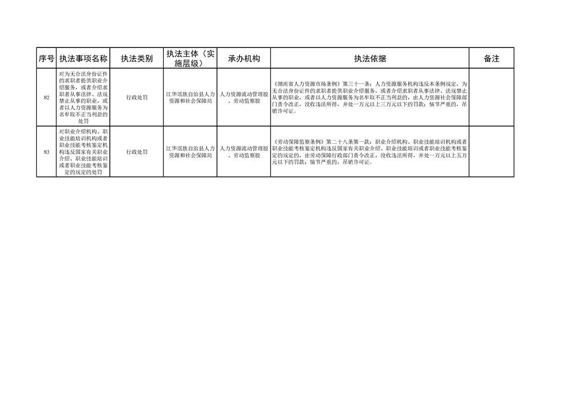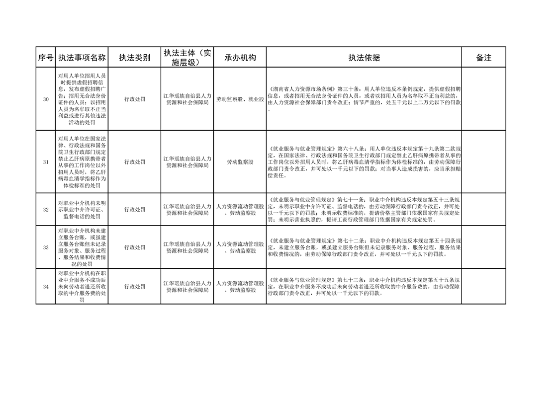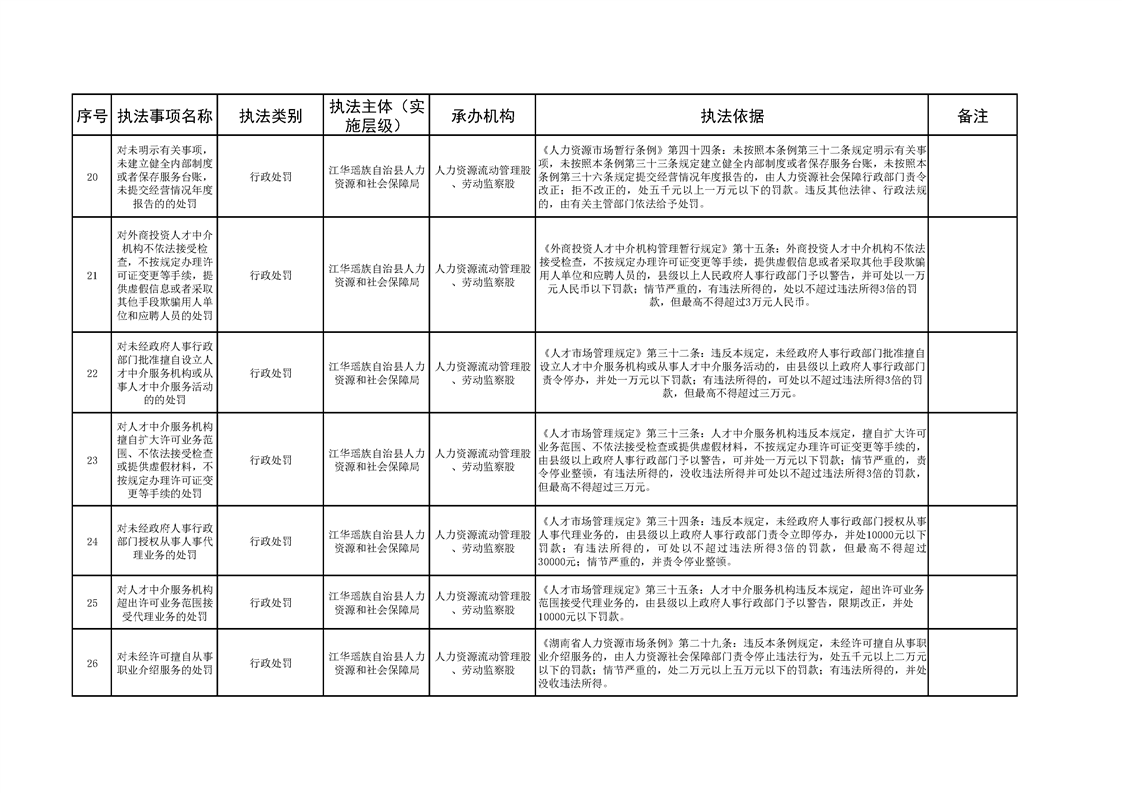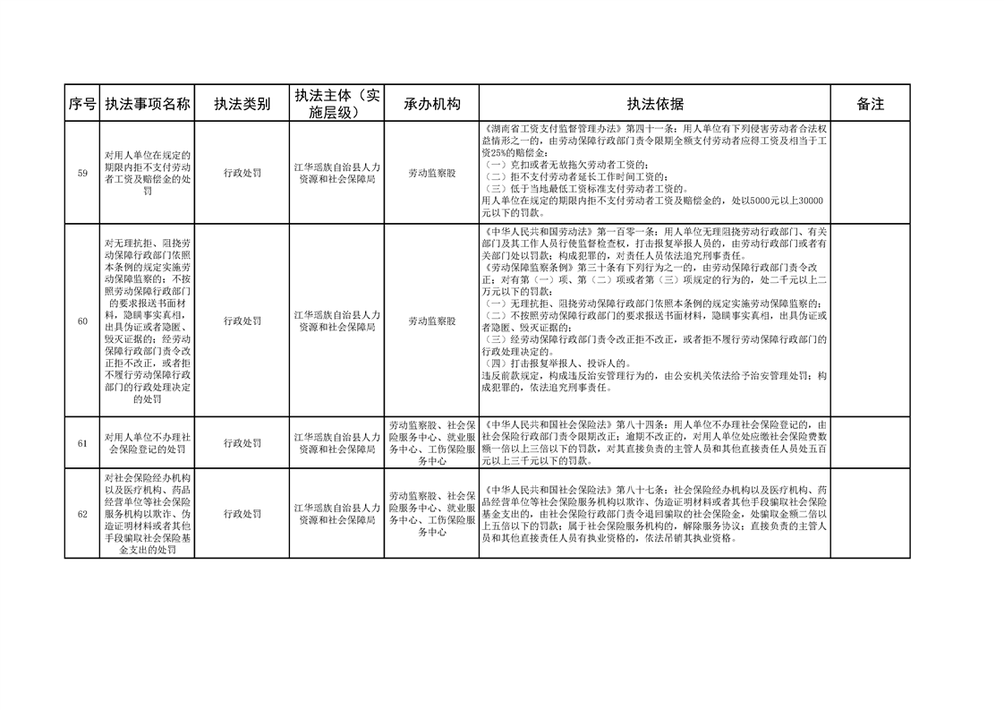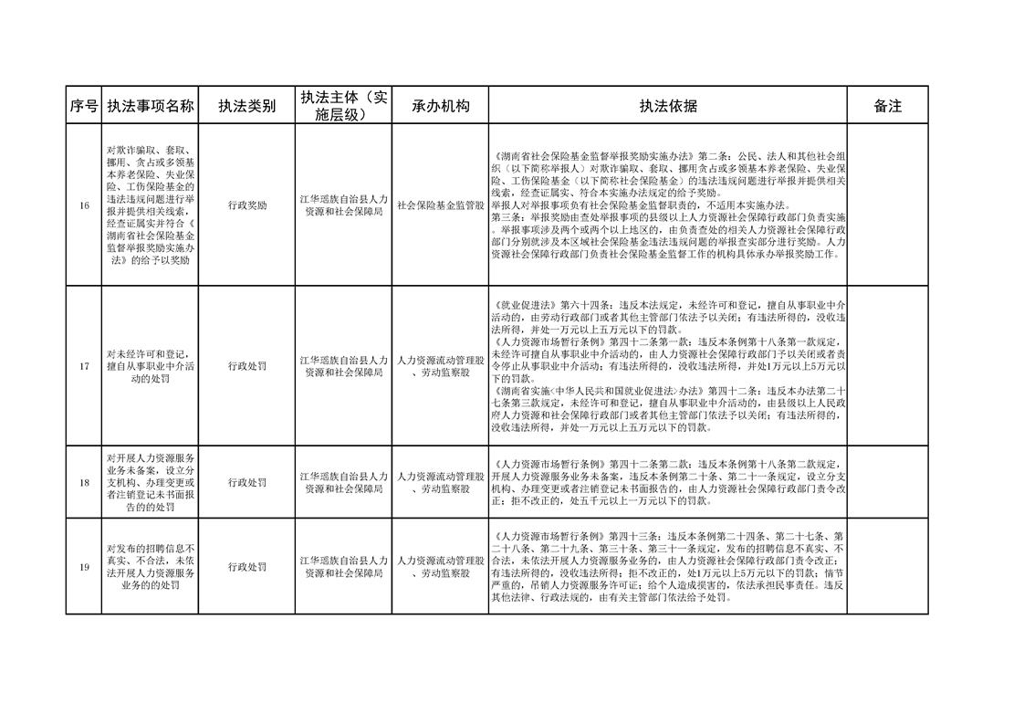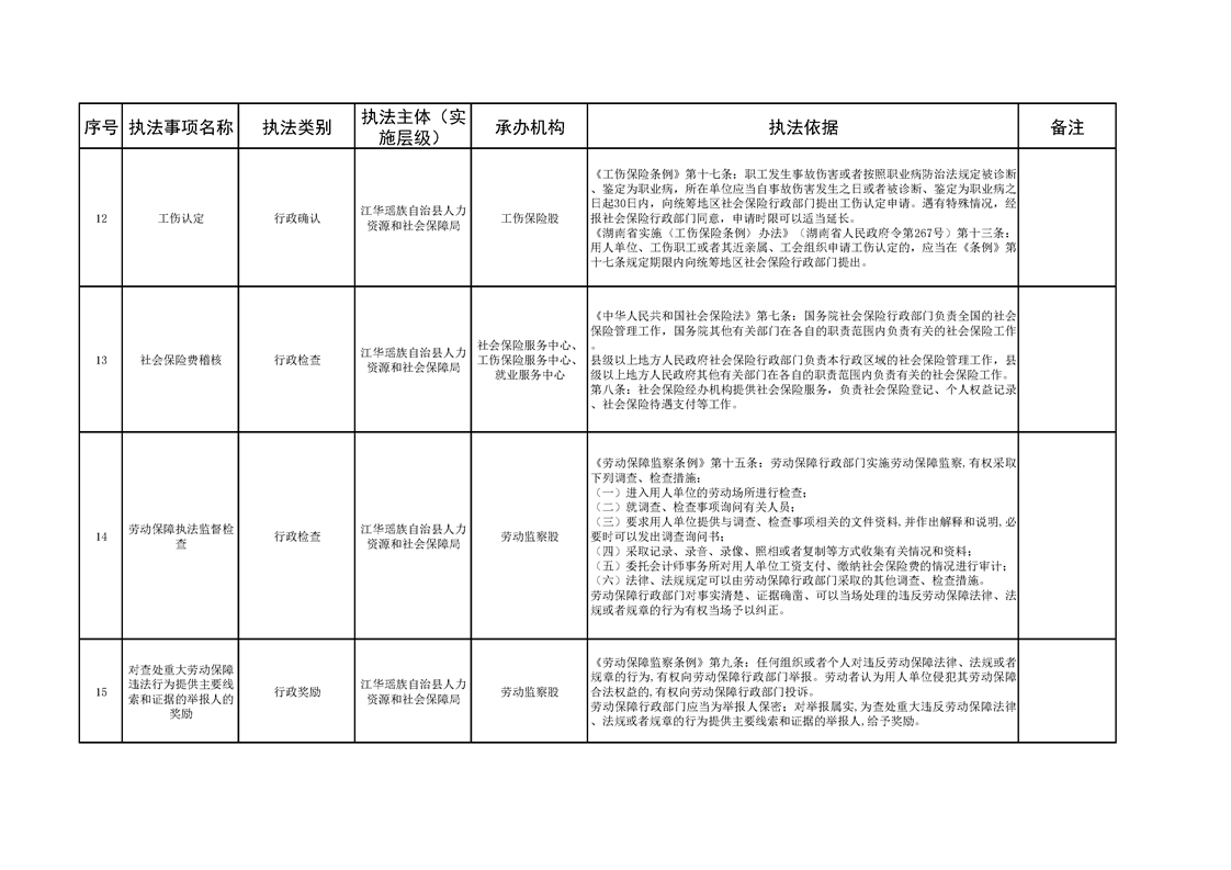 江华瑶族自治县人力资源和社会保障局行政执法事项目录