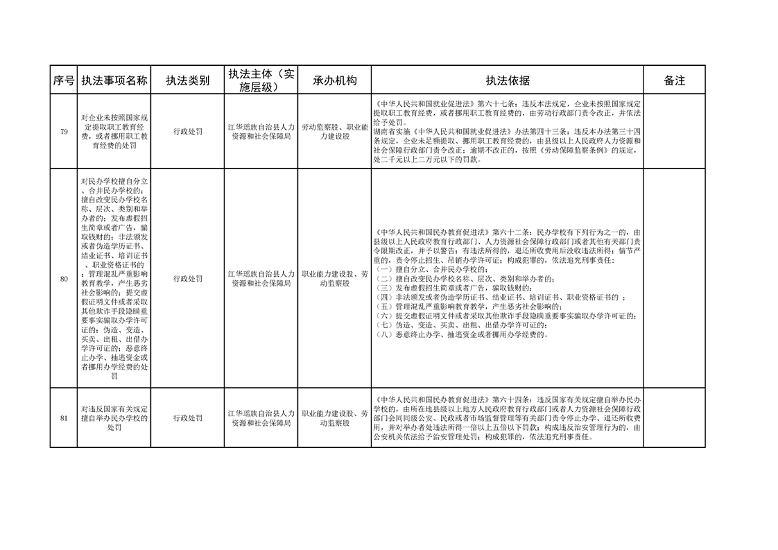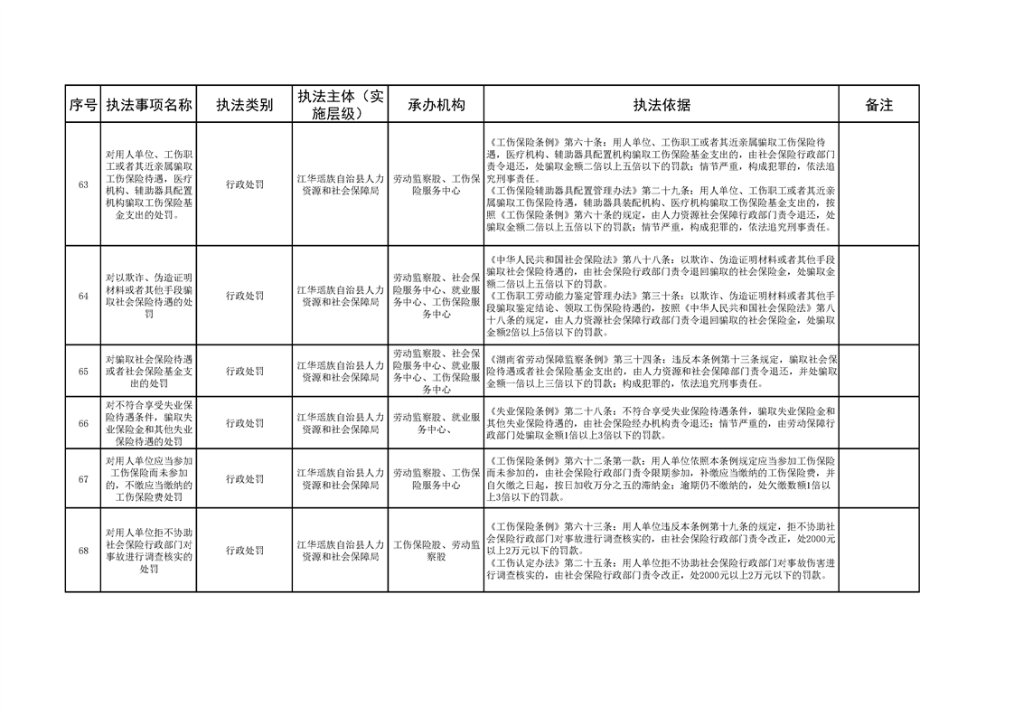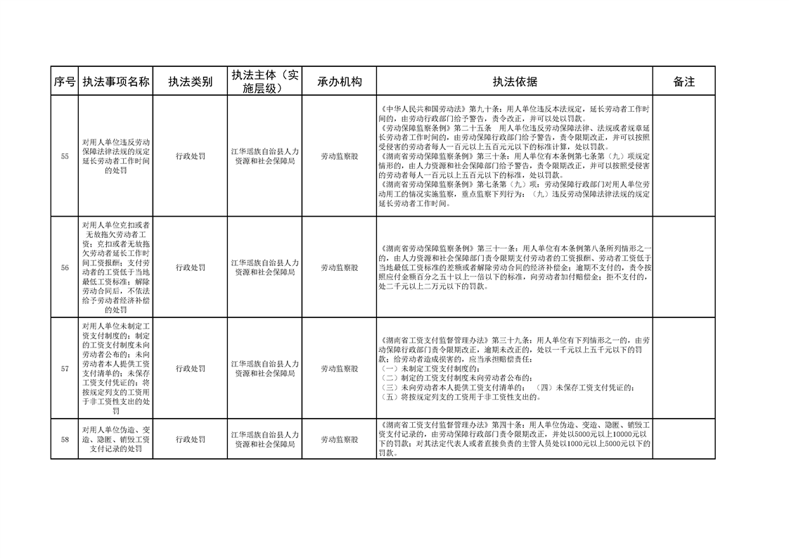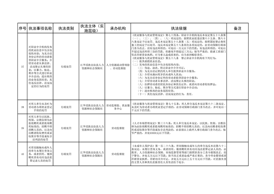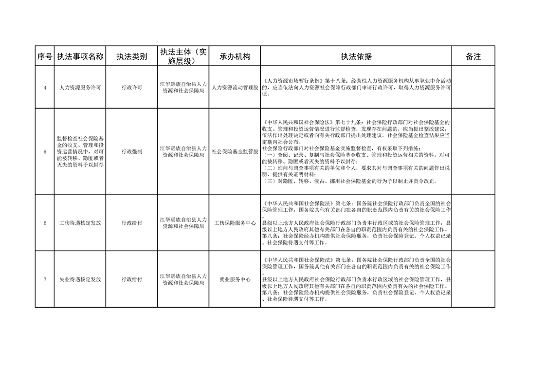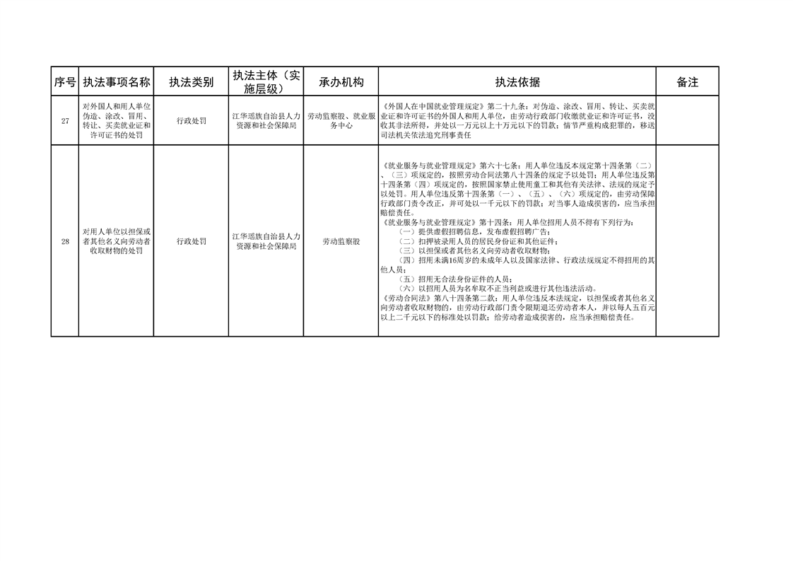 江华瑶族自治县人力资源和社会保障局行政执法事项目录