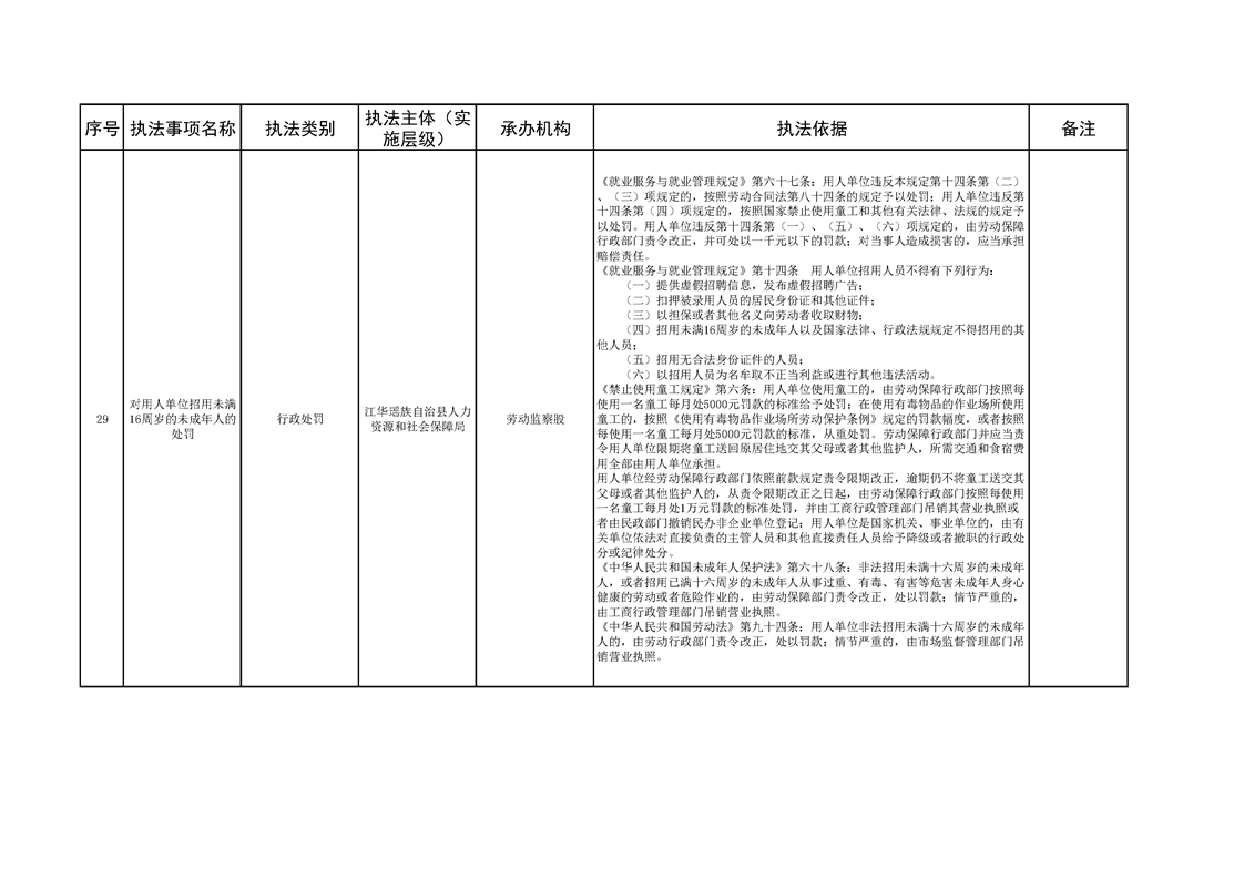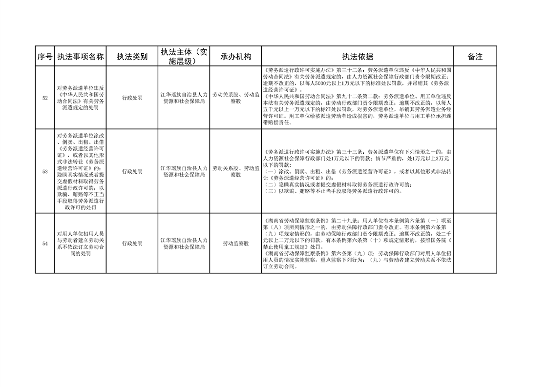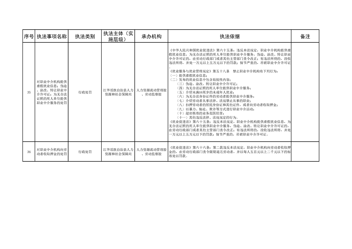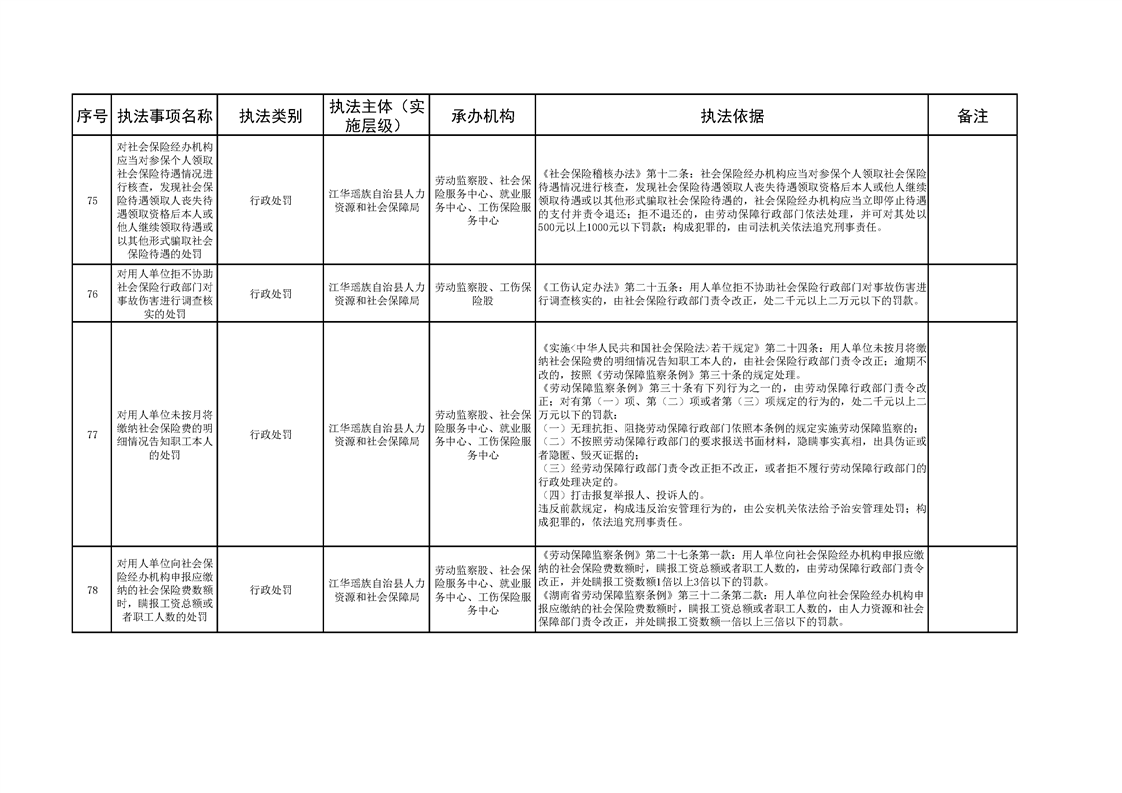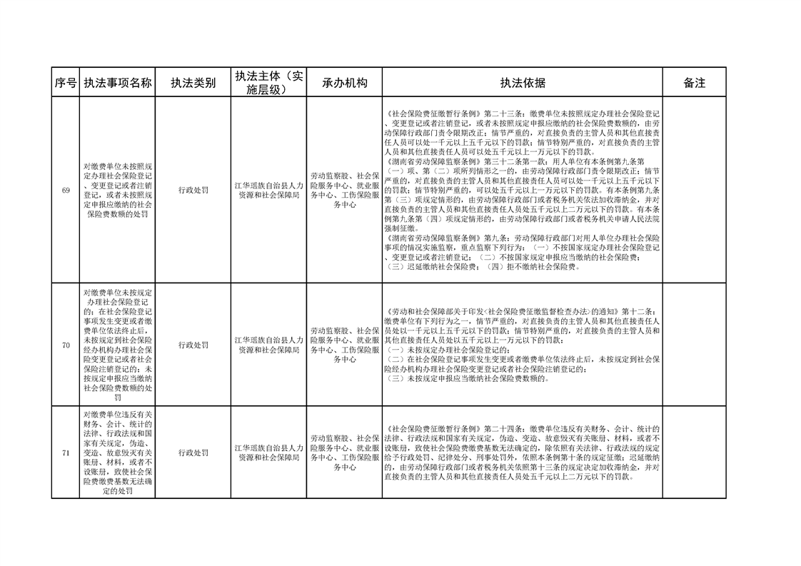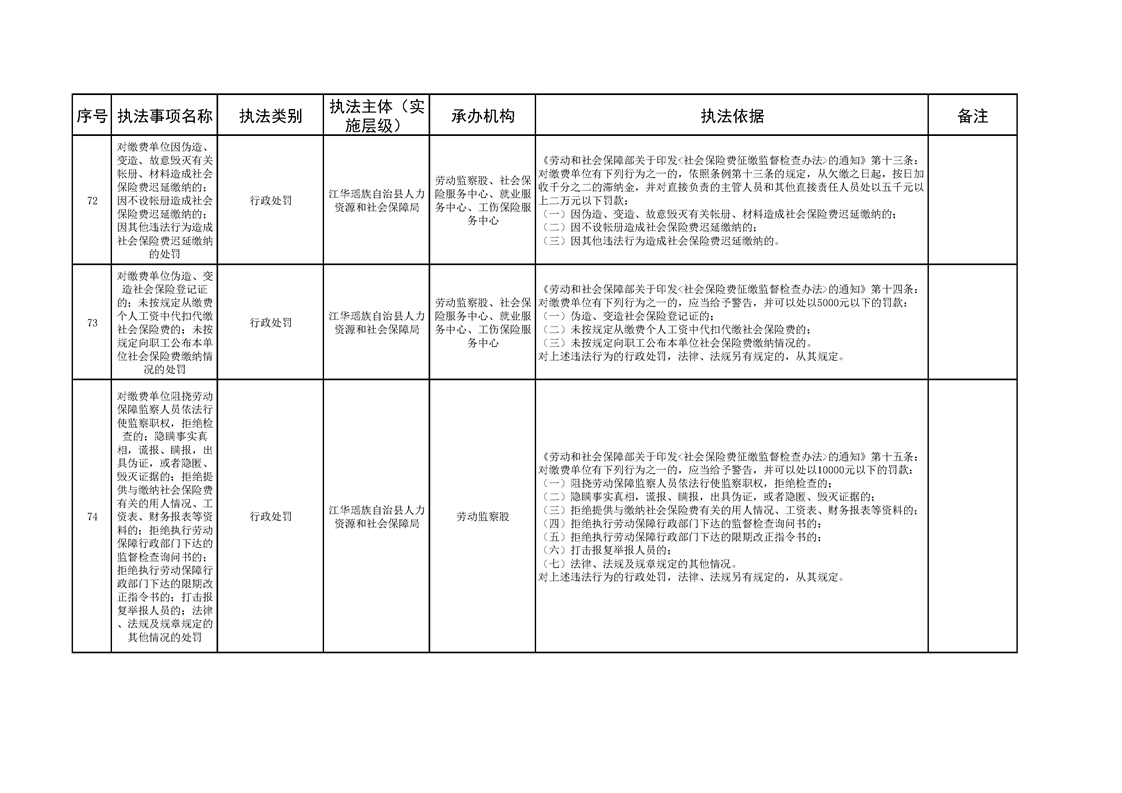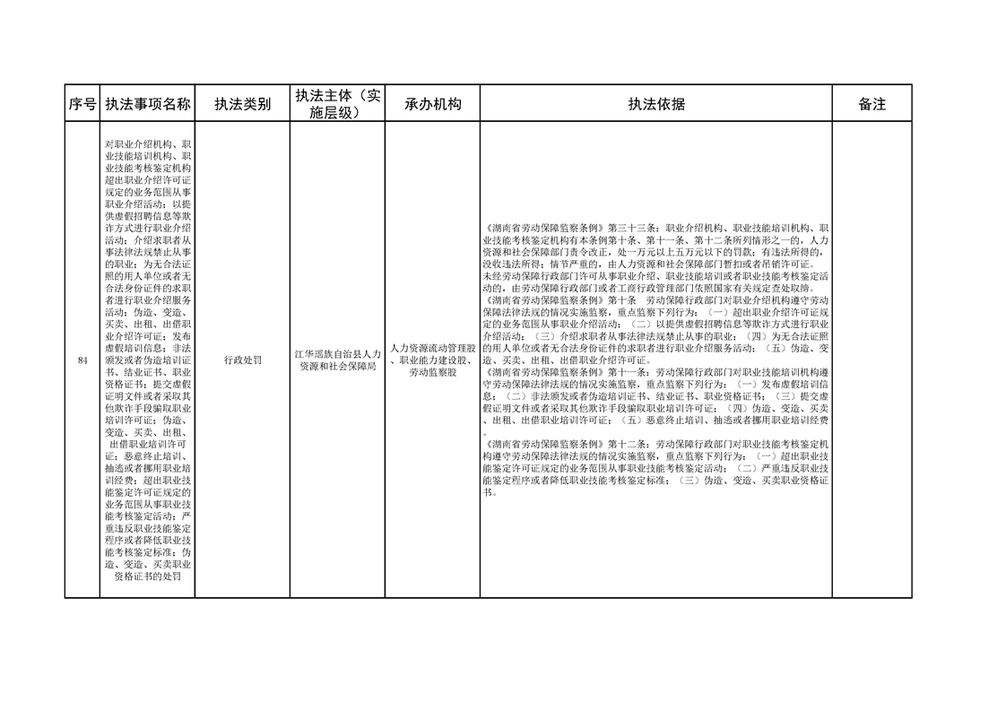 江华瑶族自治县人力资源和社会保障局行政执法事项目录