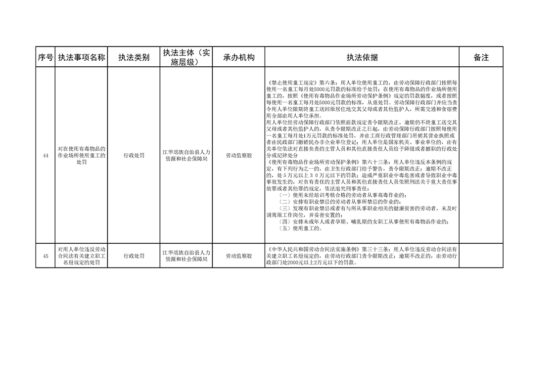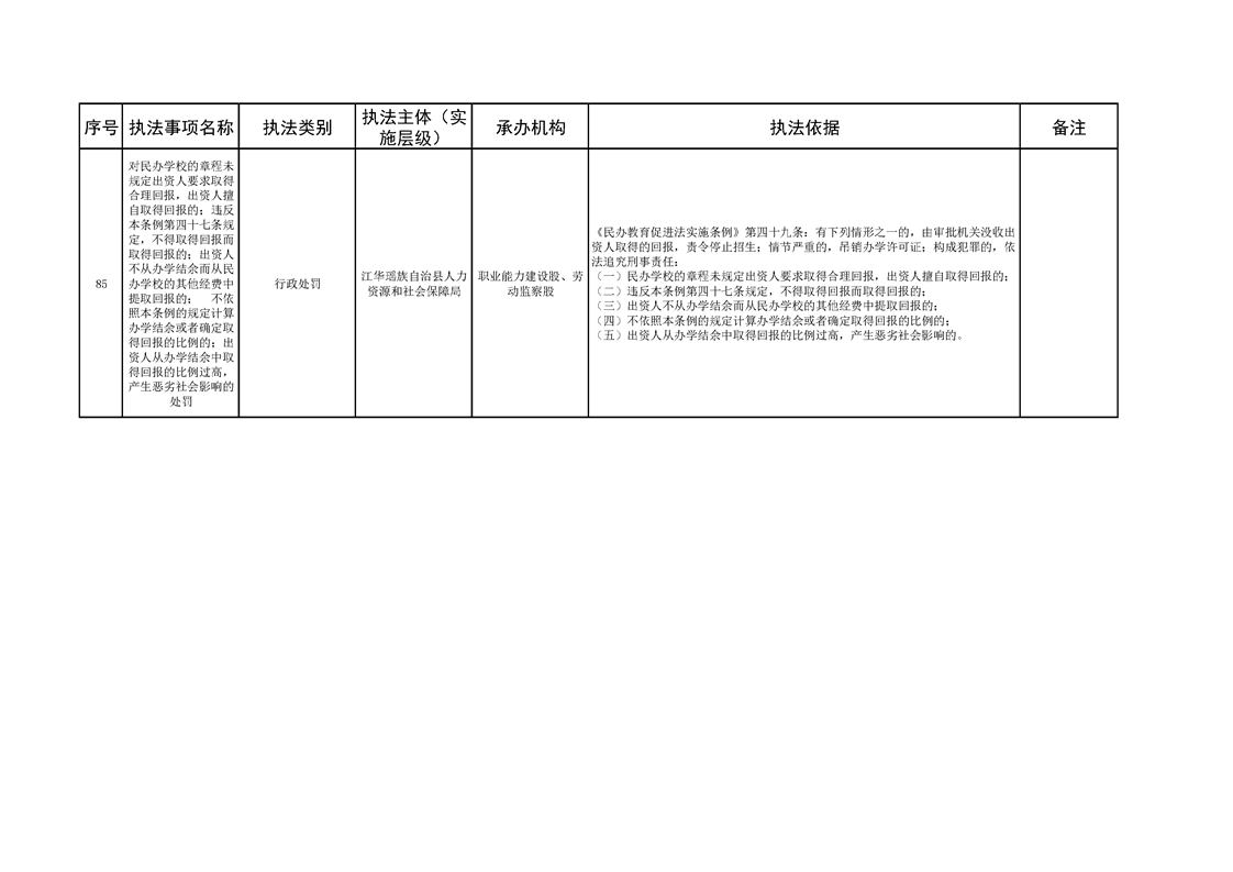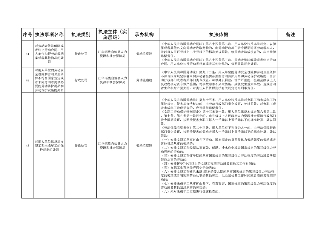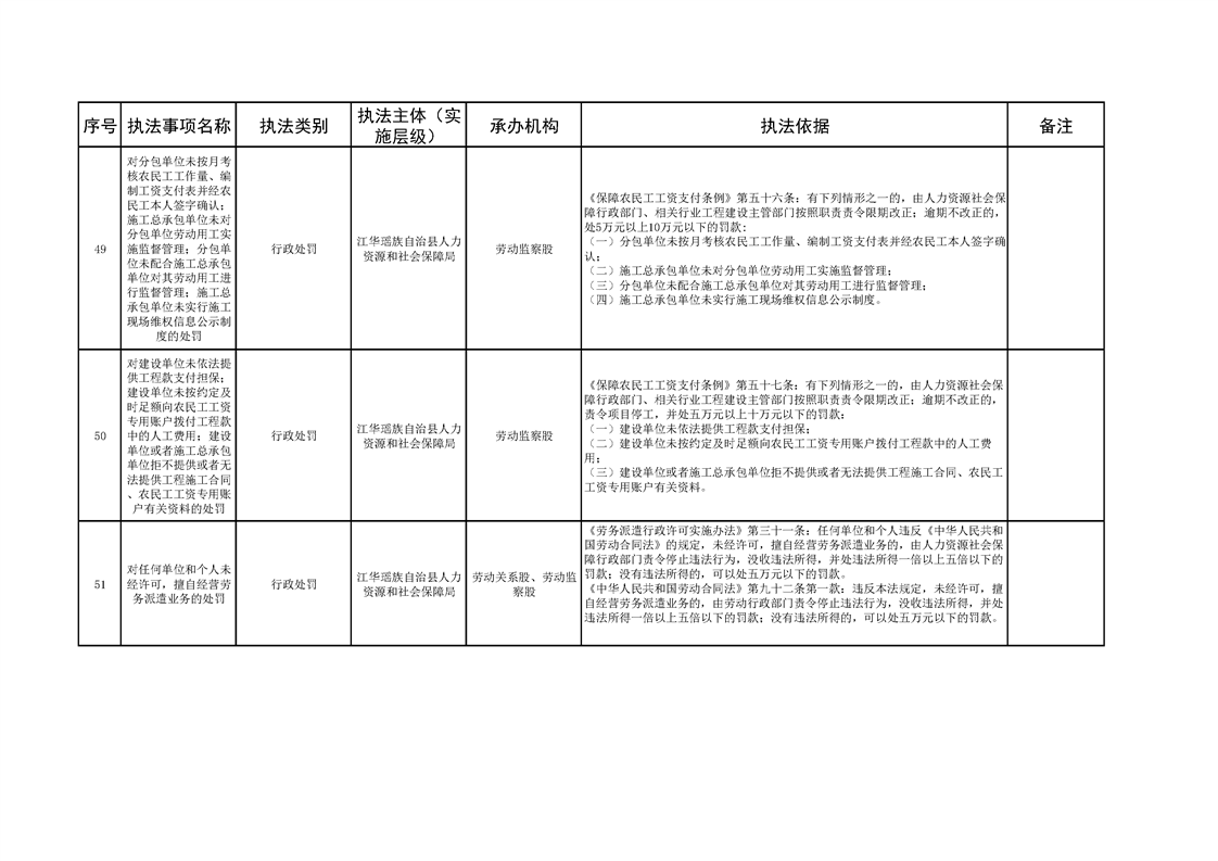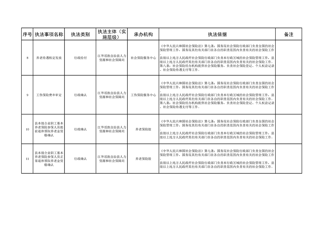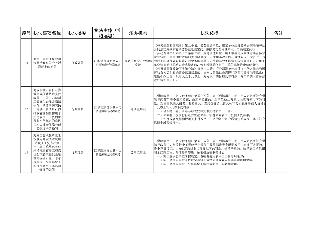 江华瑶族自治县人力资源和社会保障局行政执法事项目录