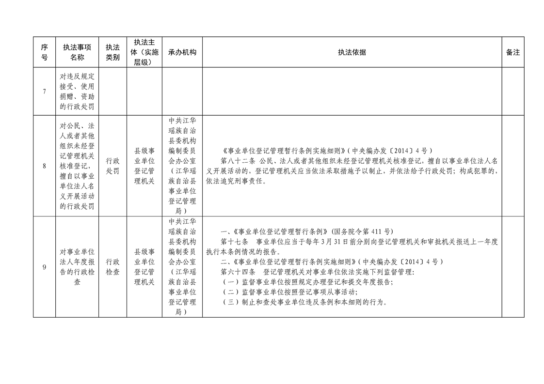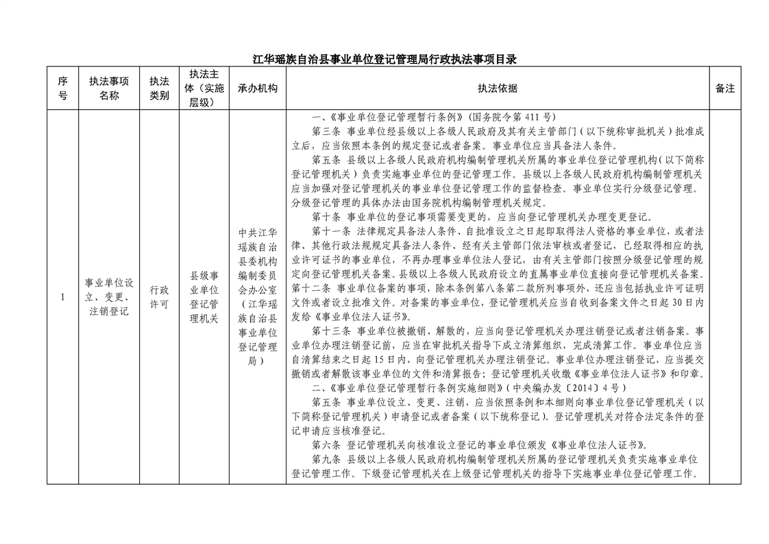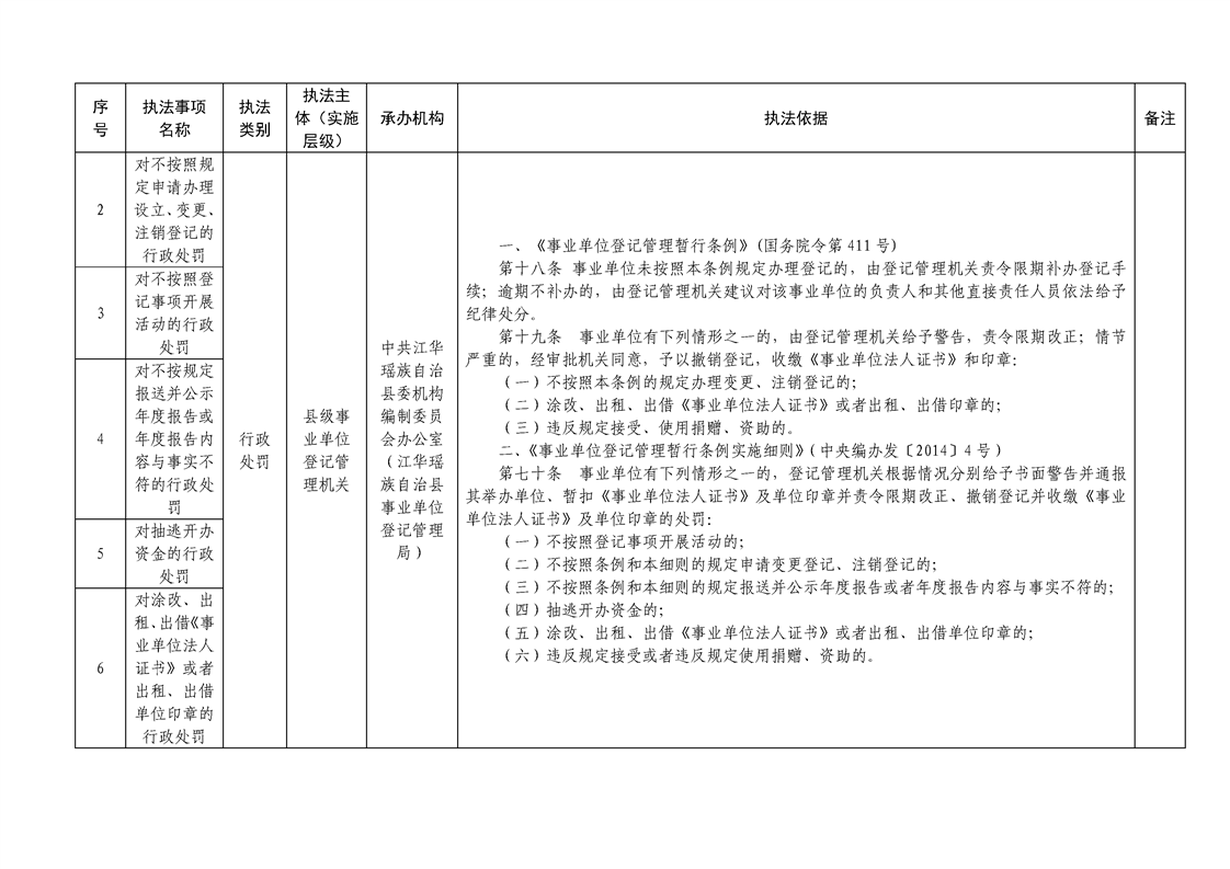 江华瑶族自治县事业单位登记管理局行政执法事项目录