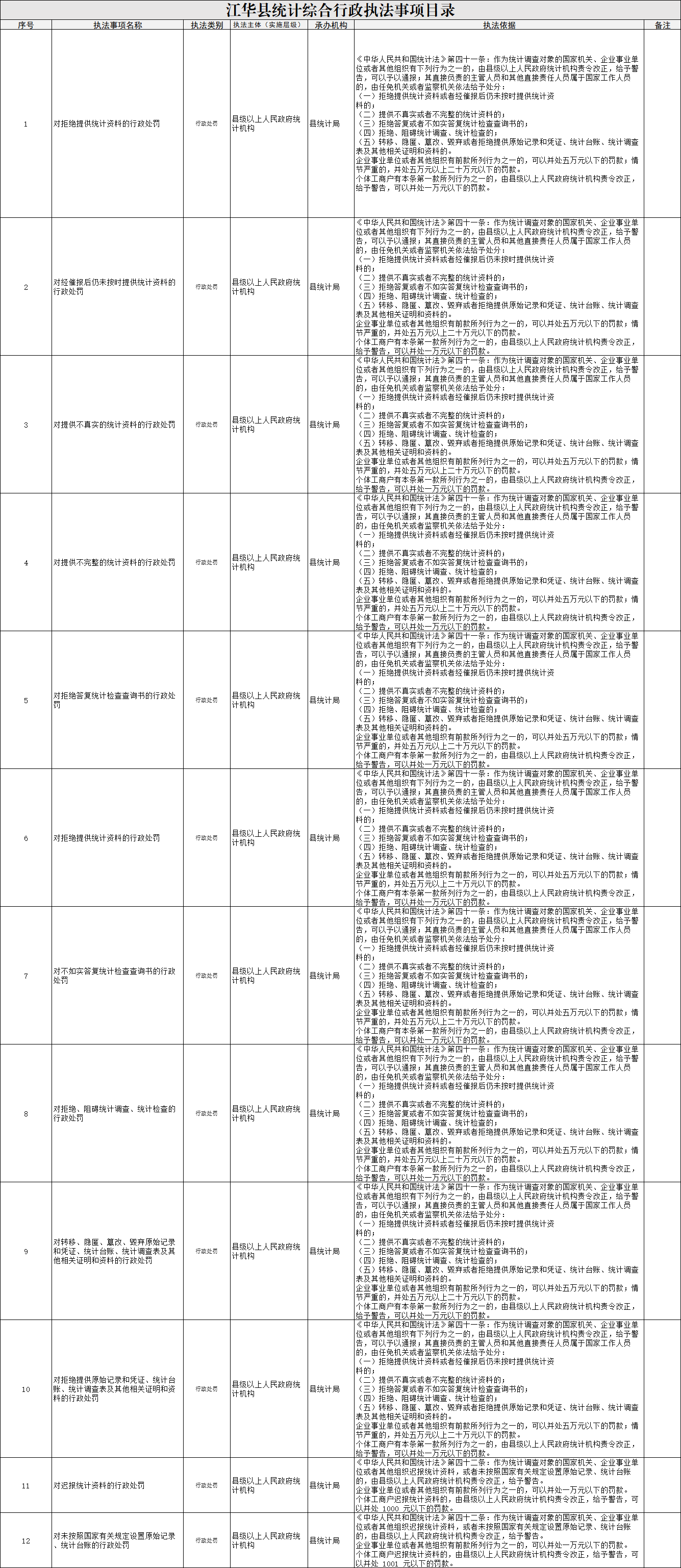 江华瑶族自治县统计局综合行政执法事项目录