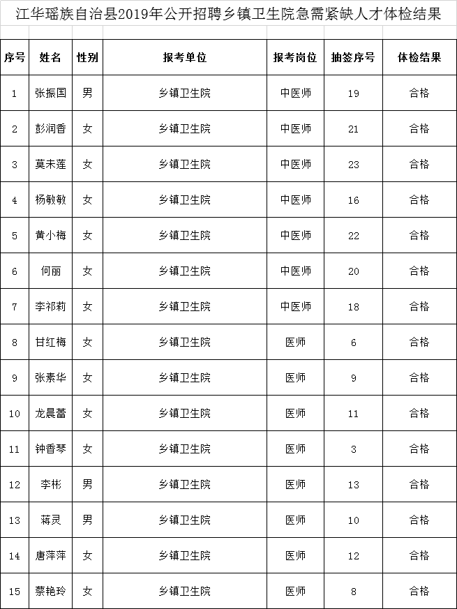 江华瑶族自治县2019年公开招聘乡镇卫生院急需紧缺人才体检结果