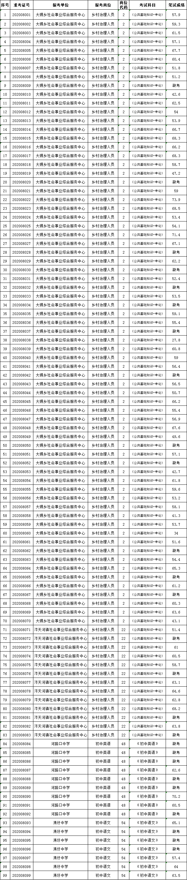 江华瑶族自治县2020年第二批基层急需紧缺人才公开招聘笔试成绩