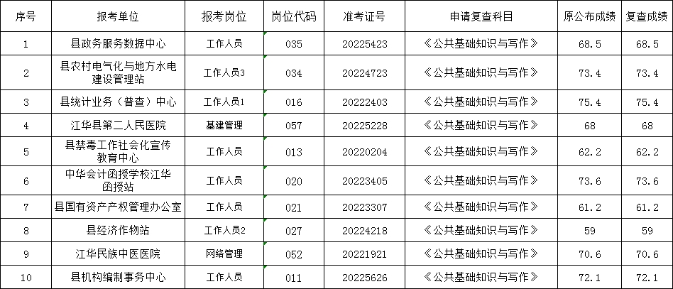 江华瑶族自治县2022年事业单位公开招聘工作人员笔试成绩复查结果公示