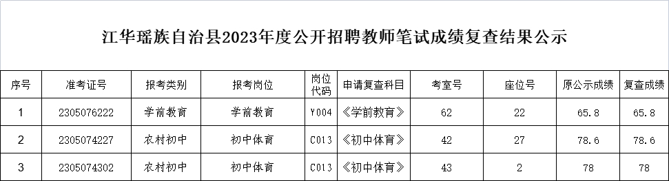 江华瑶族自治县2023年度公开招聘教师笔试成绩复查结果公示