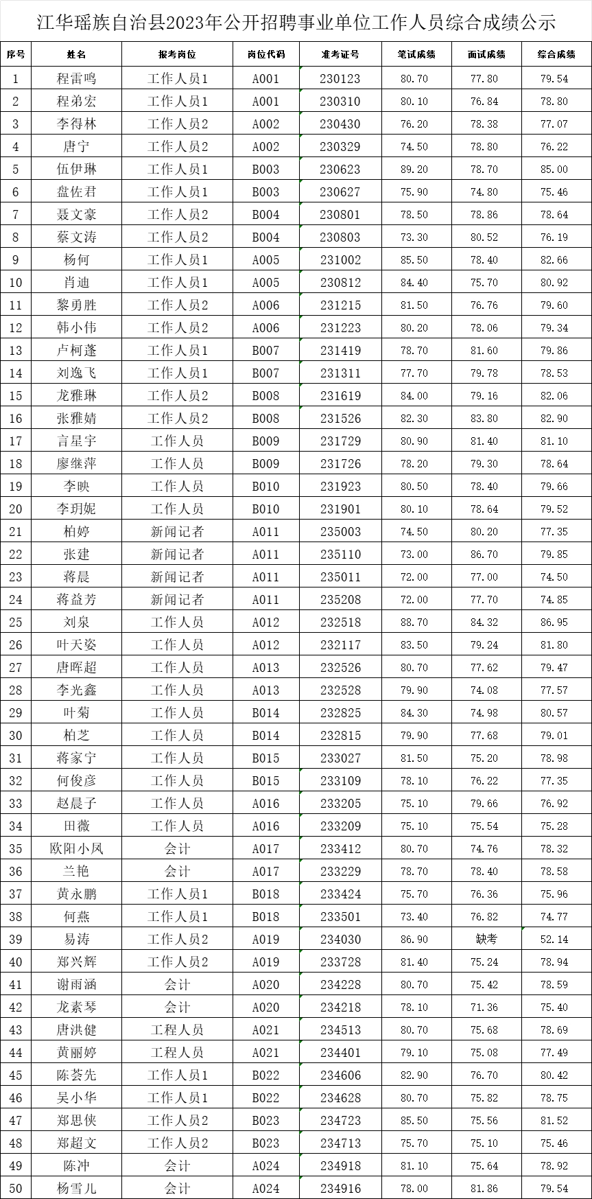 江华瑶族自治县2023年公开招聘事业单位工作人员综合成绩公示