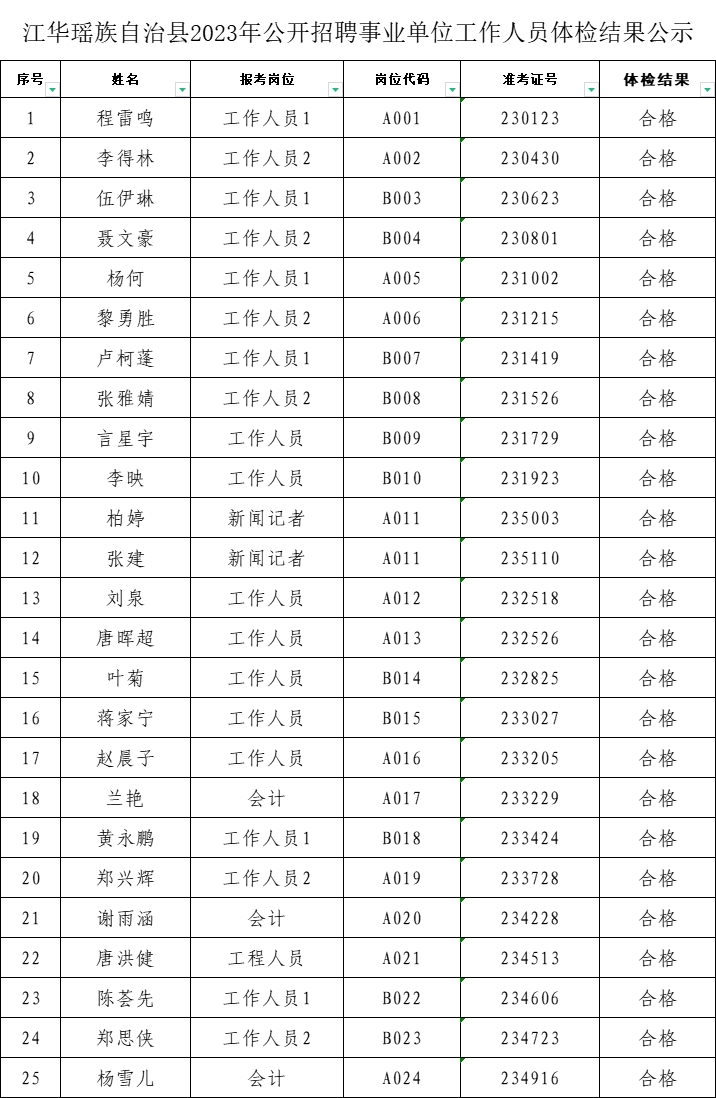 江华瑶族自治县2023年公开招聘事业单位工作人员体检结果公示