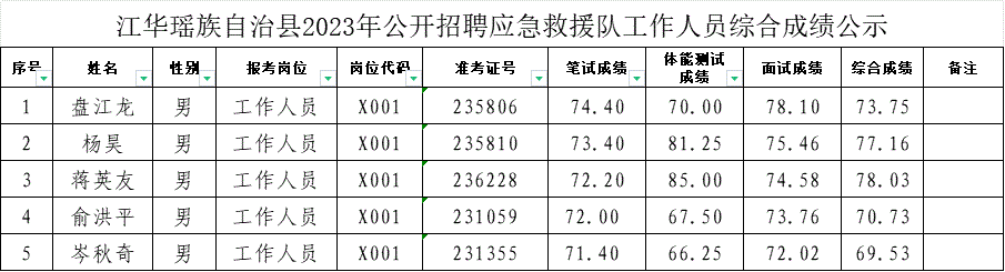 江华瑶族自治县2023年公开招聘应急救援队工作人员综合成绩公示