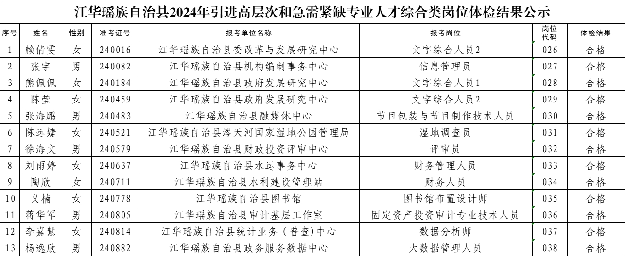 江华瑶族自治县2024年引进高层次和急需紧缺专业人才综合类岗位体检结果公示