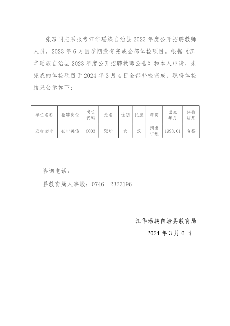 江华瑶族自治县教育系统关于张珍同志体检补检结果公示