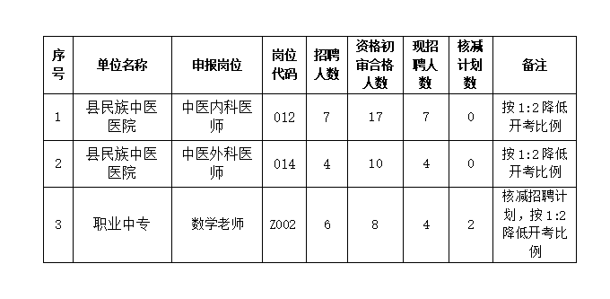 江华瑶族自治县2025年公开招聘事业单位工作人员报名资格审查工作已结束。其中,有部分岗位未达到1:3的开考比例。根据《江华瑶族自治县2025年公开招聘事业单位工作人员公告》的相关要求,经批准同意:对未达到1:3开考比例的岗位,相应降低开考比例、核减招聘计划。具体见江华瑶族自治县2025年度公开招聘事业单位工作人员降低开考比例、核减招聘计划的岗位情况表。