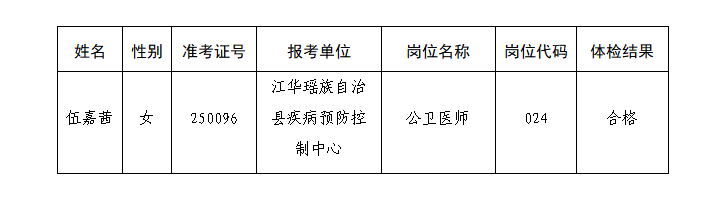 根据《江华瑶族自治县2025年引进急需紧缺专业人才公告》规定,因体检、考察过程中自愿放弃或不合格造成的岗位空缺,根据同一引进岗位综合成绩和体检、考察结果,按照综合成绩排名依次等额递补,递补最多不超过2次。现将江华瑶族自治县2025年引进急需紧缺专业人才递补人员体检结果公示如下: