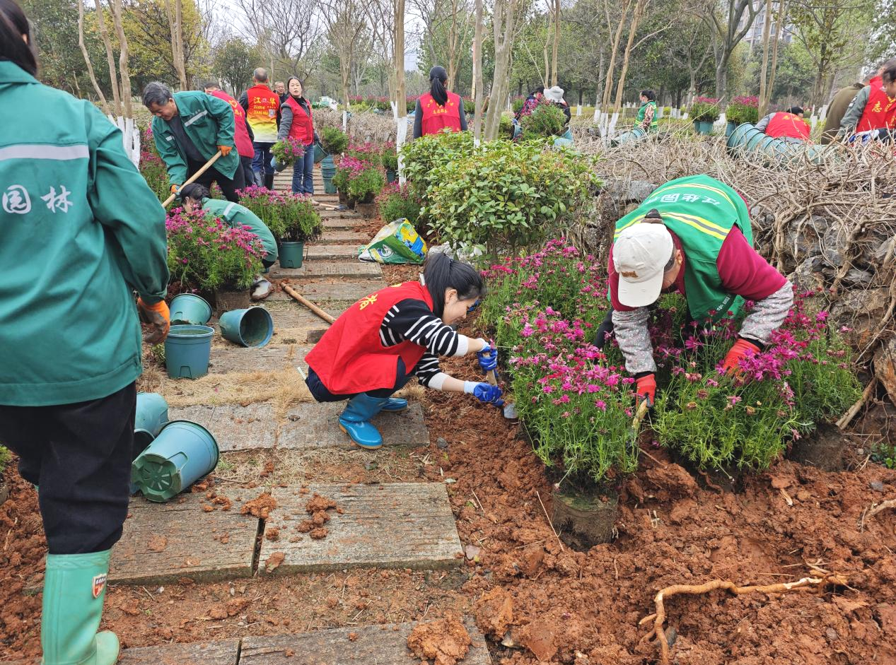 活动现场,党员干部们分成四组迅速投入战斗。尽管连日阴雨让土地泥泞难行,但身着雨靴的植绿队伍热情不减。党员们弓腰铲土种植花卉,搬运组沿着小径输送花苗,经验丰富的养护员传授栽植诀窍。劳动中汗水浸透后背,众人依然笑语盈盈。